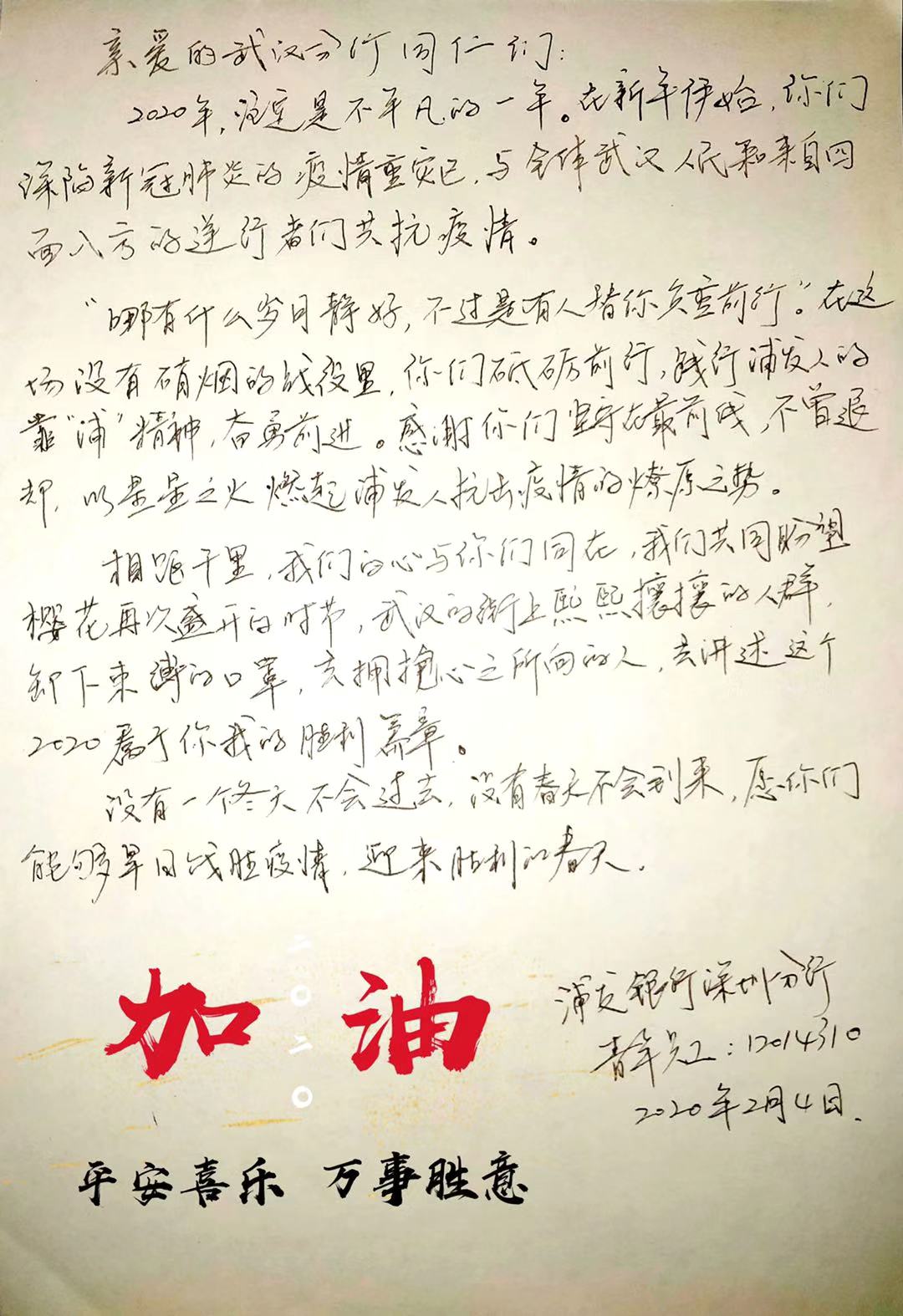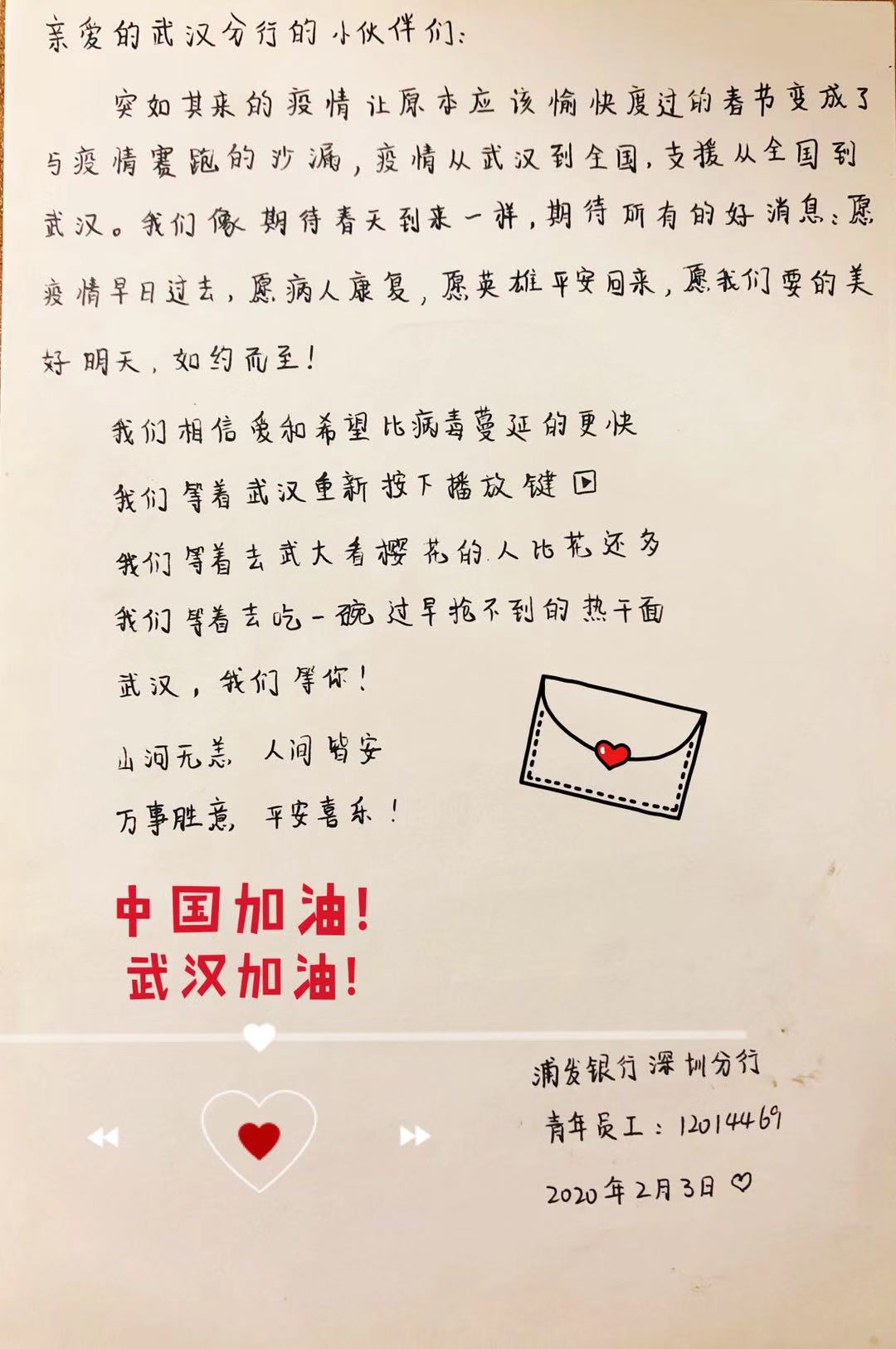 2月3日,浦發(fā)銀行深圳分行團委向全體青年員工發(fā)出了一封倡議書。在倡議書中,該行團委號召廣大團干部、團員青年立即行動,充分發(fā)揮黨的助手和后備軍作用,展現青年突擊隊作為,為堅決打贏疫情防控阻擊戰(zhàn)貢獻力量,并向青年提出三個要求:“堅定信心不迷茫,聽黨指揮勇擔當”、“科學防范不信謠,眾志成城控疫情”、“居家辦公不離崗,服從指揮勇擔當”。當日,浦發(fā)銀行深圳分行發(fā)起了給武漢分行同事寄送家書的活動,該行全體青年手寫家書,圖文并茂、紙短情長,表達了對疫區(qū)“戰(zhàn)友們”最深切的關愛和鼓勵,身體力行做好他們堅強的后盾。