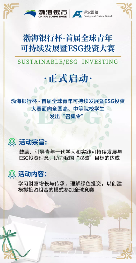 讀特客戶端 ·深圳新聞網(wǎng)8月16日訊 (通訊員 張曦)近日,由渤海銀行股份有限公司(以下簡稱“渤海銀行”)冠名,評(píng)安國蘊(yùn)(北京)科技有限公司(以下簡稱“評(píng)安國蘊(yùn)”)聯(lián)合 ACME現(xiàn)代經(jīng)濟(jì)學(xué)社、 GIC全球投資委員會(huì)共同承辦的首屆“渤海銀行杯 ·全球青年可持續(xù)發(fā)展暨 ESG投資大賽”正式啟動(dòng)!8月9日起,活動(dòng)冠名方——渤海銀行面向年滿16周歲的全國高、中等院校學(xué)生發(fā)出了“召集令”。