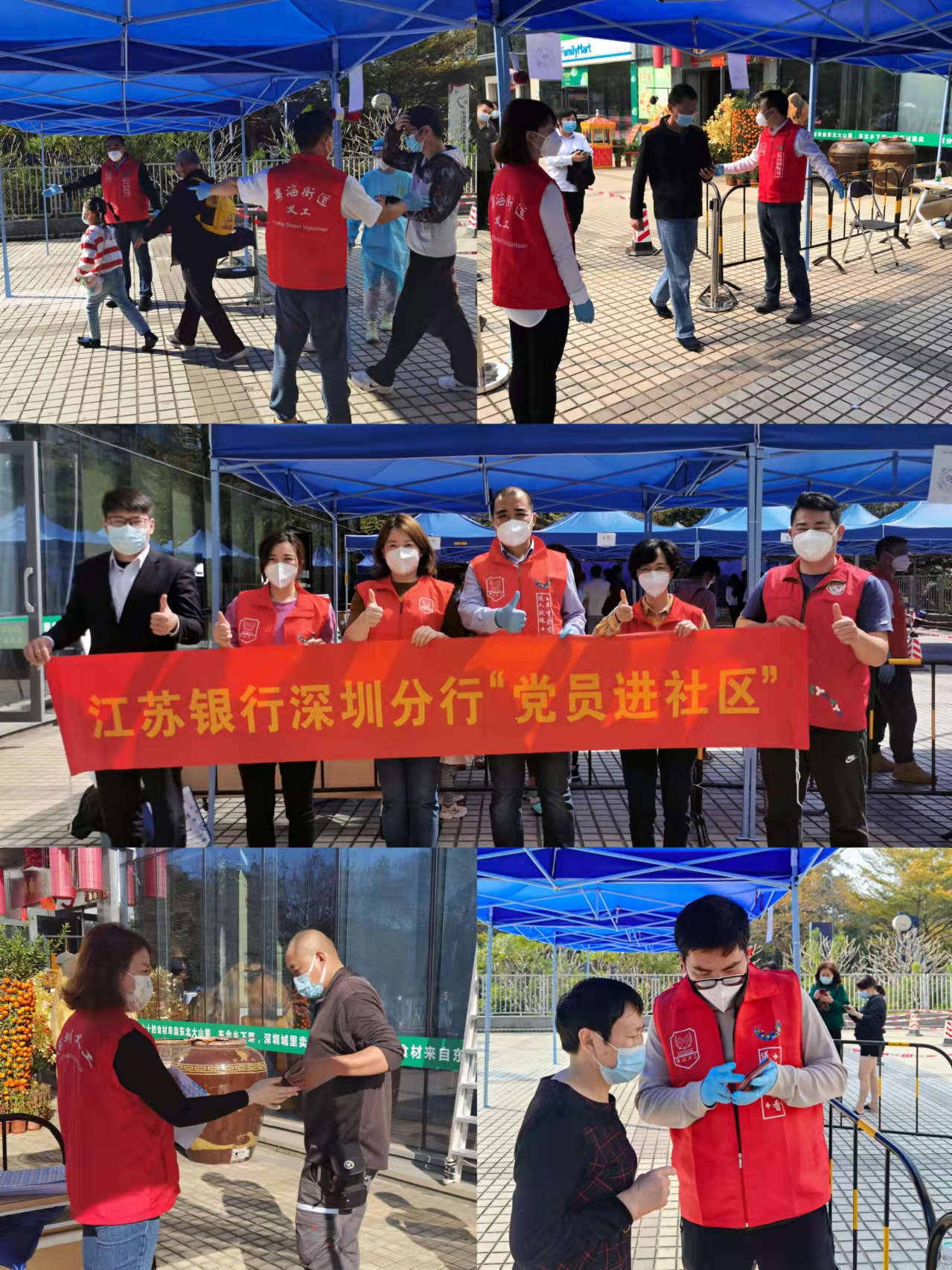 在該行黨委統(tǒng)一部署及有效組織下,江蘇銀行深圳分行營業(yè)部、福田支行、南山支行、前海支行等基層黨組織快速響應(yīng),立即組建起由黨支部書記、支行行長帶頭的志愿先鋒隊。2月中旬起,江蘇銀行深圳分行志愿先鋒隊忙碌在福田海濱社區(qū)、南山蔚藍(lán)海岸社區(qū)、高新區(qū)社區(qū)等多個核酸檢測點(diǎn),在核酸采樣現(xiàn)場提醒民眾查驗健康碼、協(xié)助秩序維護(hù)、做好防疫宣傳、協(xié)助搬運(yùn)物資、進(jìn)行核酸引導(dǎo)、解答防疫問題。與社區(qū)醫(yī)護(hù)人員一起奮斗在抗疫第一線,用行動踐行初心,用汗水書寫擔(dān)當(dāng),用責(zé)任與堅守共筑抗疫“紅色防線”。