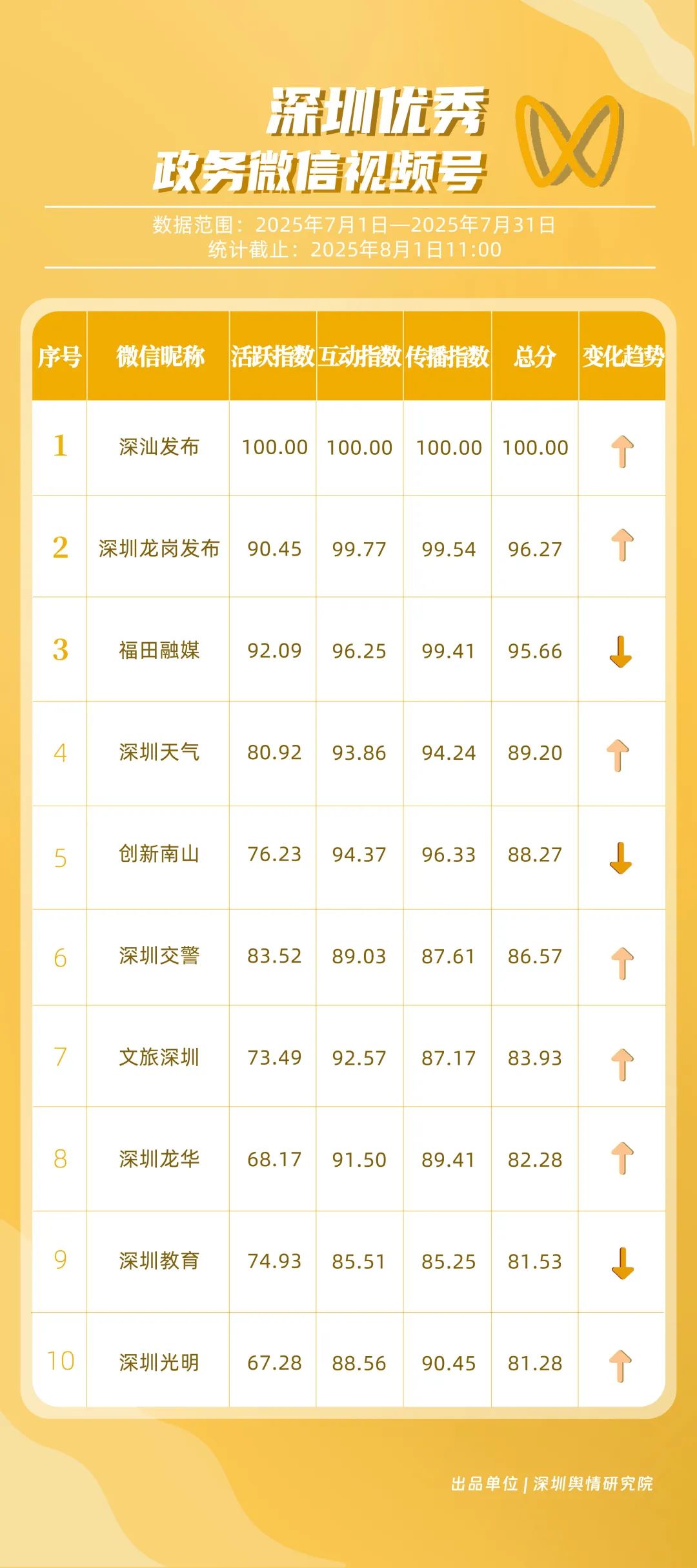7月,深圳政務(wù)新媒體矩陣各展所長,為市民帶來豐富實(shí)用的信息服務(wù)。龍崗區(qū)、福田區(qū)、南山區(qū)、市衛(wèi)生健康委員會、市氣象局(臺)、深汕特別合作區(qū)、龍華區(qū)、市公安局交通管理支隊(duì)、光明區(qū)、市消防救援支隊(duì)的新媒體矩陣入選“深圳優(yōu)秀政務(wù)新媒體矩陣”榜單。值得關(guān)注的是,龍崗區(qū)新媒體矩陣在7月著力提升內(nèi)容質(zhì)量,于抖音和微信視頻號平臺得分顯著提高,成功登頂;福田區(qū)新媒體矩陣在抖音平臺表現(xiàn)突出,位列榜單第二;南山區(qū)新媒體矩陣則在微博和抖音平臺保持評分優(yōu)勢。此外,市氣象局(臺)、市公安局交通管理支隊(duì)和光明區(qū)的排名也實(shí)現(xiàn)明顯上升,體現(xiàn)出政務(wù)新媒體矩陣整體競爭力持續(xù)增強(qiáng)。