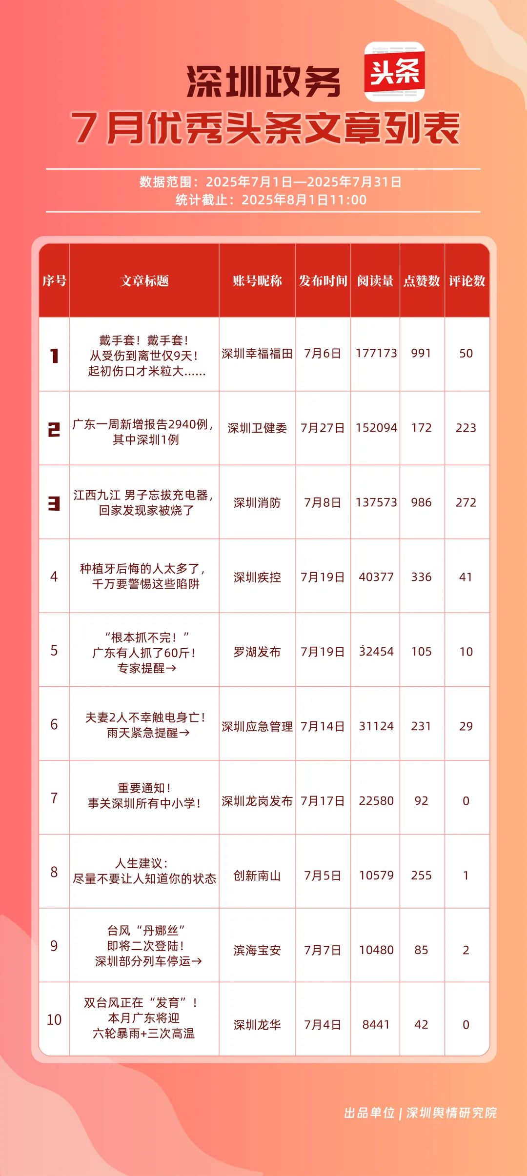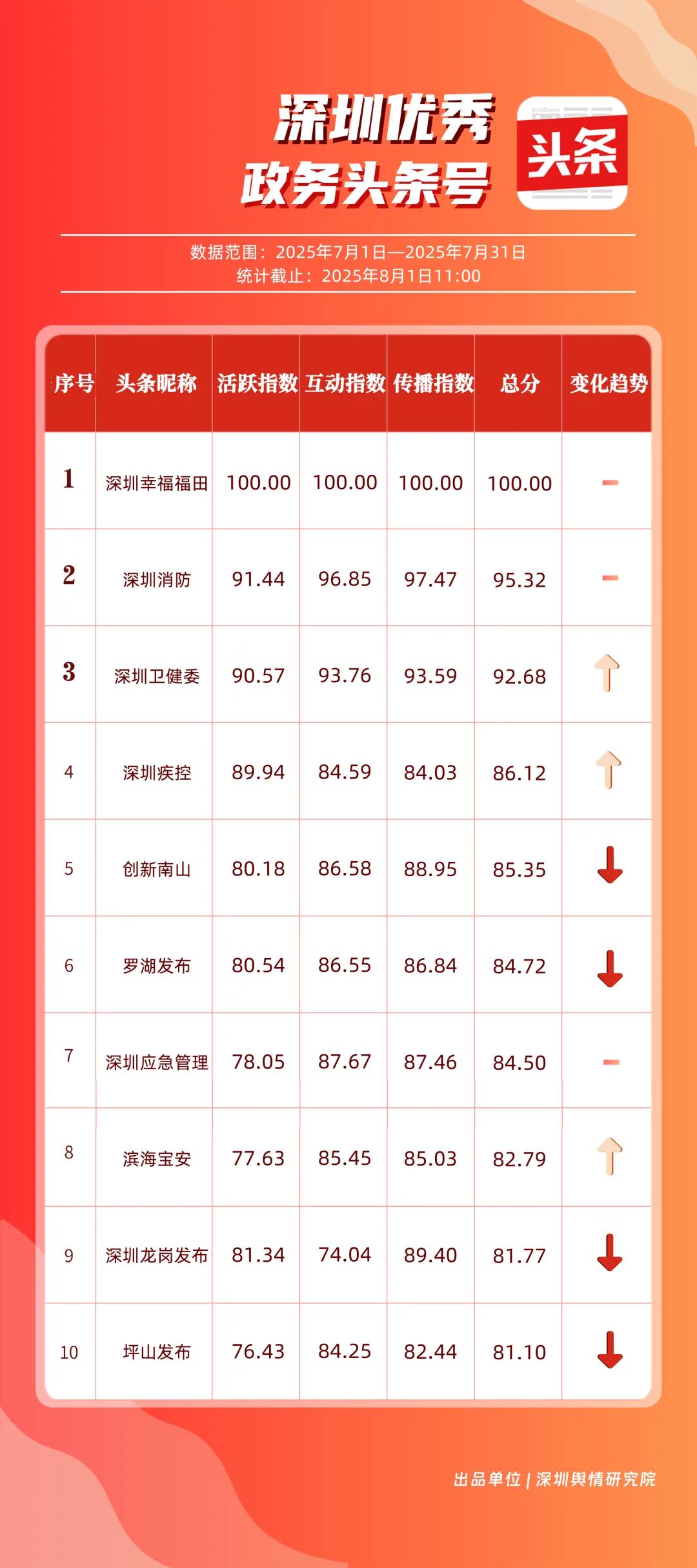 7月,“深圳幸福福田”“深圳消防”“深圳衛(wèi)健委”“深圳疾控”“創(chuàng)新南山”“羅湖發(fā)布”“深圳應(yīng)急管理”“濱海寶安”“深圳龍崗發(fā)布”“坪山發(fā)布”共10個(gè)政務(wù)頭條號入選“優(yōu)秀政務(wù)頭條號”榜單?!吧钲谛腋8L铩薄吧钲谙馈睉{借優(yōu)質(zhì)內(nèi)容持續(xù)吸引用戶關(guān)注,穩(wěn)居前二;“深圳衛(wèi)健委”表現(xiàn)亮眼,評分達(dá)92.68分,排名較6月有所上升;“深圳疾控”同樣進(jìn)步明顯,在疾病預(yù)防控制信息傳播上發(fā)揮了重要作用?!皠?chuàng)新南山”“羅湖發(fā)布”“深圳應(yīng)急管理”等上榜賬號,也各展所長,始終將優(yōu)質(zhì)內(nèi)容作為核心抓手,成為政務(wù)新媒體領(lǐng)域內(nèi)容創(chuàng)作與傳播的典范。
