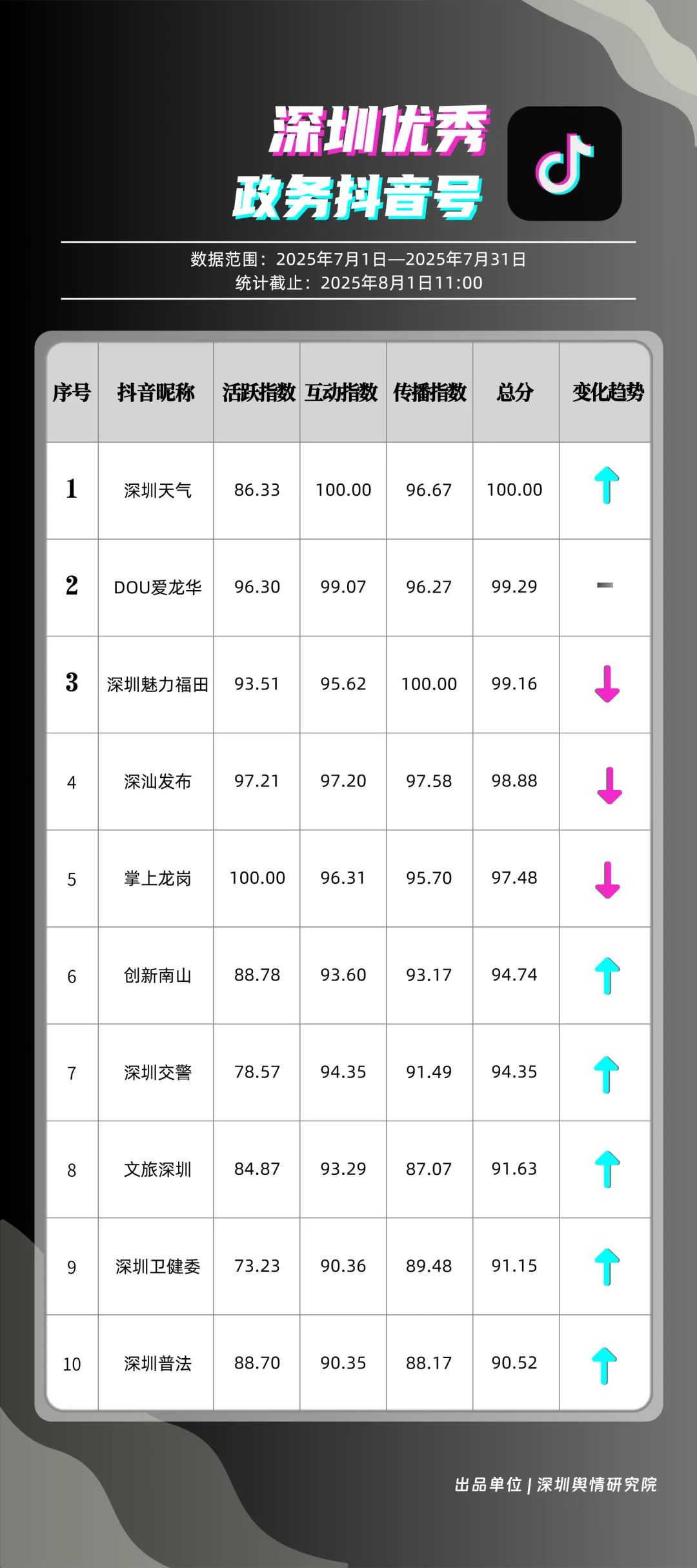 7月,“深圳天氣”“DOU愛龍華”“深圳魅力福田”“深汕發(fā)布”“掌上龍崗”“創(chuàng)新南山”“深圳交警”“文旅深圳”“深圳衛(wèi)健委”“深圳普法”共10個(gè)政務(wù)抖音號獲得“優(yōu)秀政務(wù)抖音號”稱號。其中,“深圳天氣”互動(dòng)指標(biāo)獲滿分,憑借氣象與趣味相結(jié)合的創(chuàng)新科普形式,領(lǐng)跑優(yōu)秀政務(wù)抖音號;“DOU愛龍華”“深圳魅力福田”分別位列第二、三名,通過聚焦網(wǎng)絡(luò)熱點(diǎn)、挖掘創(chuàng)意內(nèi)容,不斷提升傳播效能,展現(xiàn)出強(qiáng)大的政務(wù)新媒體影響力;“深汕發(fā)布”“掌上龍崗”“創(chuàng)新南山”等賬號緊隨其后,上榜的優(yōu)質(zhì)政務(wù)抖音號用短視頻語言強(qiáng)化傳播效果,展現(xiàn)了鮮明的賬號特色和風(fēng)采。