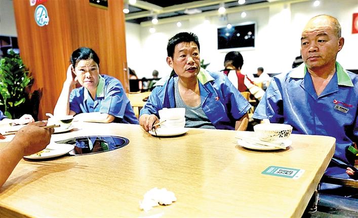 在店里吃飯的人群里,有一張臺全是清一色的藍(lán)色工作服,特別顯眼?!拔覀兠刻於紩磉@里吃早餐,差不多有一年時間了,這里的老板太好了,希望他能一直開下去。”這幾個大叔、大嬸是周邊物業(yè)的清潔工人,他們每天早上5點鐘就上崗工作,忙完就到了6-7點,又餓又累,有一碗熱騰騰的早餐是一件非常幸福的事,而這種開心快樂的事情在這里發(fā)生了。吳姓清潔工說,這里的老板和員工很好,大家來這里吃粥,沒有感到半點不自在,就像在自己家一樣。