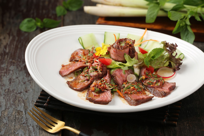 牛肉被貼心地切成小塊,以辣椒醬、檸檬汁、魚(yú)露、香茅、蒜頭、蠔油等調(diào)味料先醃漬入味,煎至表皮微焦後再烘烤,微透著肉粉色就知道多鮮嫩又不失咬勁,微辣帶酸的滋味,令人印象深刻。