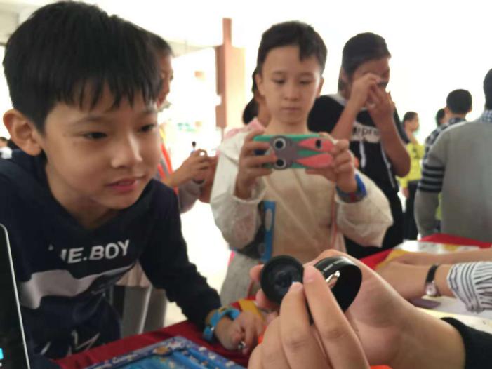 科普益智互動(dòng)游戲精彩紛呈,深圳阿卡索資訊股份有限公司的華容道大闖關(guān)、筷子夾彈珠互動(dòng)游戲極大激發(fā)了同學(xué)們的參與熱情。深圳市夢飛翔文化傳播有限公司及深圳諾必達(dá)節(jié)能環(huán)保有限公司的智能陪伴機(jī)器人能詩歌能朗誦,“通今博古”能答疑解惑,成為同學(xué)們的良師益友。各種技能培訓(xùn)在其中兩家學(xué)校同步開展,包括中廣和(深圳)科技有限公司的兒童護(hù)理實(shí)用技能、深圳光影教育投資有限公司的手機(jī)和單反使用講座、深圳市海文深生物科技有限公司的牙膏制作工藝展示等項(xiàng)目,讓孩子們收獲不少生活技能。