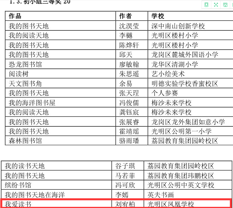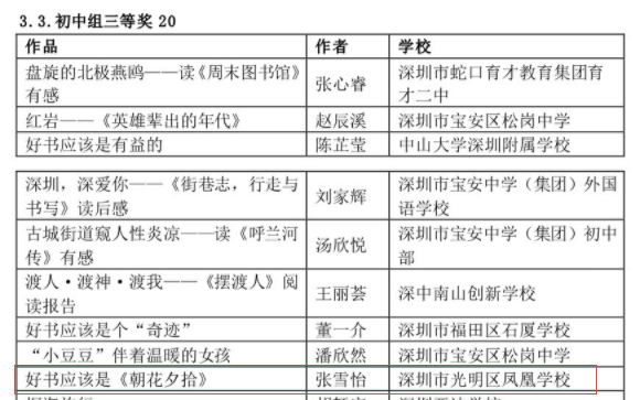 在深圳市4·23世界讀書日“探索閱讀新領(lǐng)域”創(chuàng)作比賽中學(xué)校榮獲優(yōu)秀組織獎(jiǎng),何雨晴、劉宥伯同學(xué)分別獲初小組二等獎(jiǎng)、三等獎(jiǎng);阮澤宇、張雪怡同學(xué)分別榮獲初中組二等獎(jiǎng)、三等獎(jiǎng)。郭瑞芳老師榮獲優(yōu)秀指導(dǎo)老師獎(jiǎng),曾嵽稜、賴美君、李海亮榮獲優(yōu)秀組織老師獎(jiǎng)。