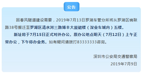公告 因春風(fēng)隧道建設(shè)需要,2019年7月13日羅湖車管分所將從羅湖區(qū)錦聯(lián)路38號搬遷至羅湖區(qū)清水河三路博豐大廈裙樓(深業(yè)車城內(nèi))五樓。_ _ _ _ _ 羅湖分所新址采用全開放式的業(yè)務(wù)辦理窗口,并配套了多種自助辦理設(shè)備,為群眾構(gòu)建更加便捷高效、自主貼心的辦事環(huán)境。