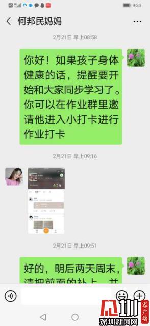 星河學(xué)校作為一個(gè)農(nóng)民工子弟占99%的公益民辦學(xué)校,1600多個(gè)學(xué)生和大部分老師在全國各地。學(xué)??朔щy,分兩批將學(xué)校19臺(tái)電腦寄到部分老師的老家,保證在線教學(xué)順利進(jìn)行。身在湖南的馮讓老師既是五年級(jí)1班班主任,也是小學(xué)語文教研組組長(zhǎng),收到學(xué)校寄送的電腦后立刻進(jìn)行直播。她班上有一名父母在深圳、留守在爺爺奶奶身邊的學(xué)生,因地處偏僻沒有網(wǎng)絡(luò)、父母不在身邊有些情緒,無心學(xué)習(xí)。了解情況后馮老師不厭其煩給學(xué)生打電話,和家長(zhǎng)溝通,終于在2月20日收到了孩子的作業(yè)打卡。經(jīng)過馮老師持續(xù)耐心的努力,目前孩子一直克服困難堅(jiān)持學(xué)習(xí)。