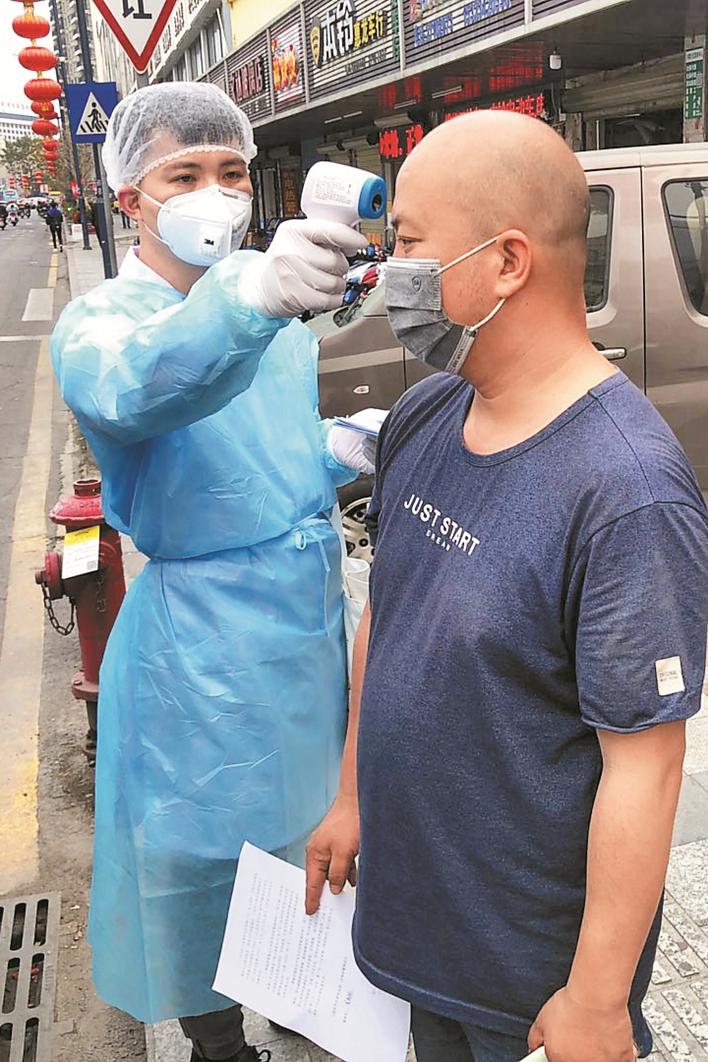 曾煥文(左)為居民測量體溫。