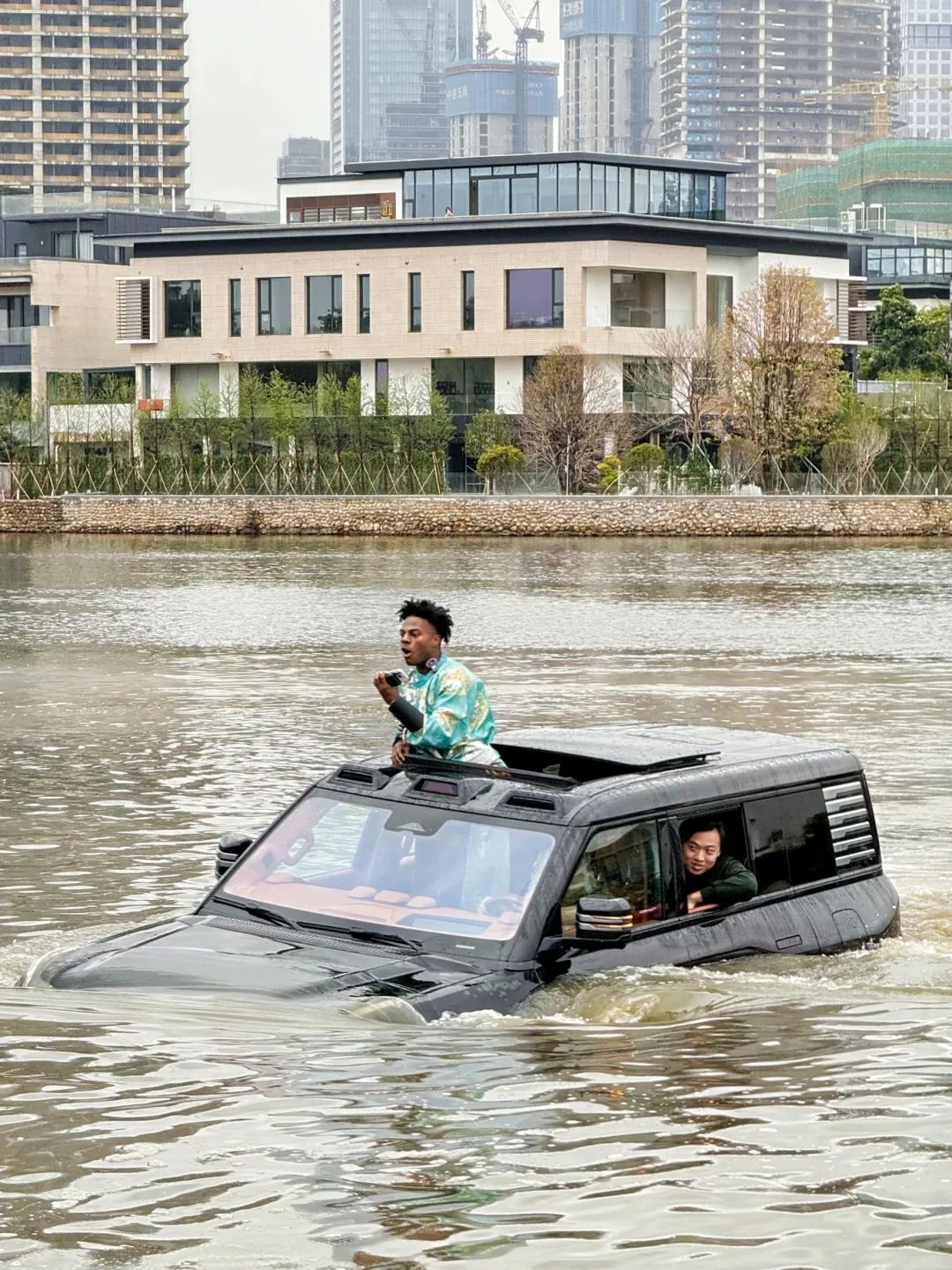 深圳直播第一站,甲亢哥選擇在歡樂海岸體驗(yàn)比亞迪仰望U8浮水。他先是興致勃勃地與比亞迪仰望U7“斗舞”。