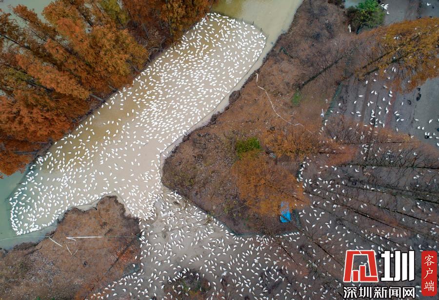 2019年12月1日,江蘇省宿遷市泗洪縣,航拍5000多只四季鵝在陳圩林場的樹林下吃食的壯觀場景。