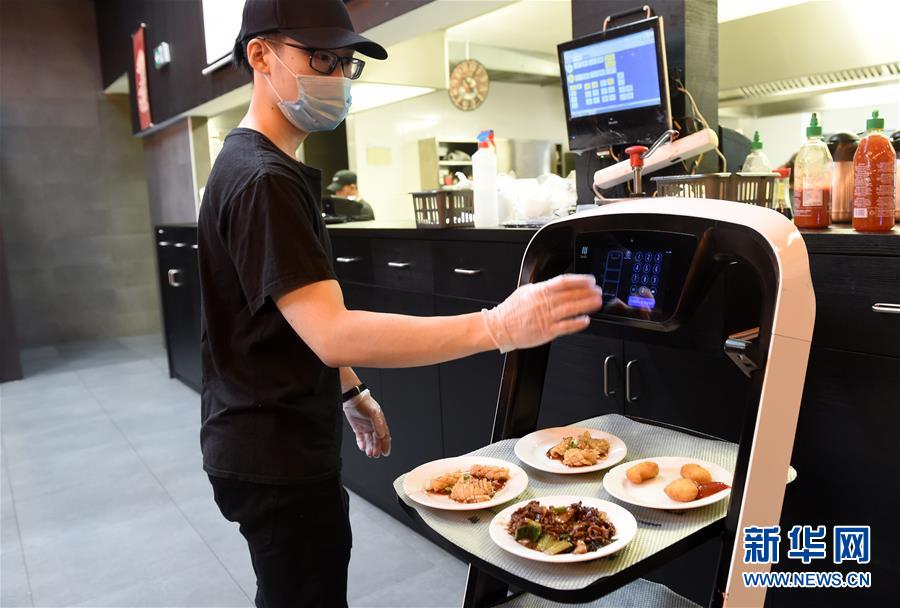 5月28日,在奧地利維也納一家亞洲餐廳內,服務員為機器人設置送餐桌號。維也納的一家亞洲餐廳于疫情期間重新營業(yè)后,更多利用機器人上菜,以減少服務員和顧客之間的非必要接觸。新華社記者郭晨攝