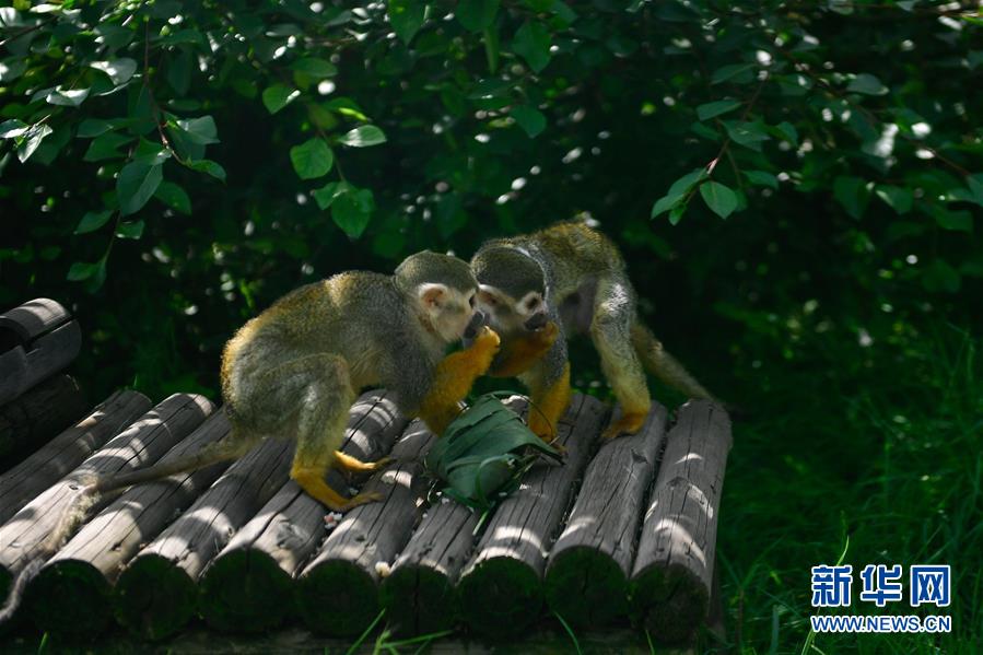 6月25日,在青海省西寧野生動物園,兩只松鼠猴在享用小朋友們包的粽子。新華社記者 張龍 攝