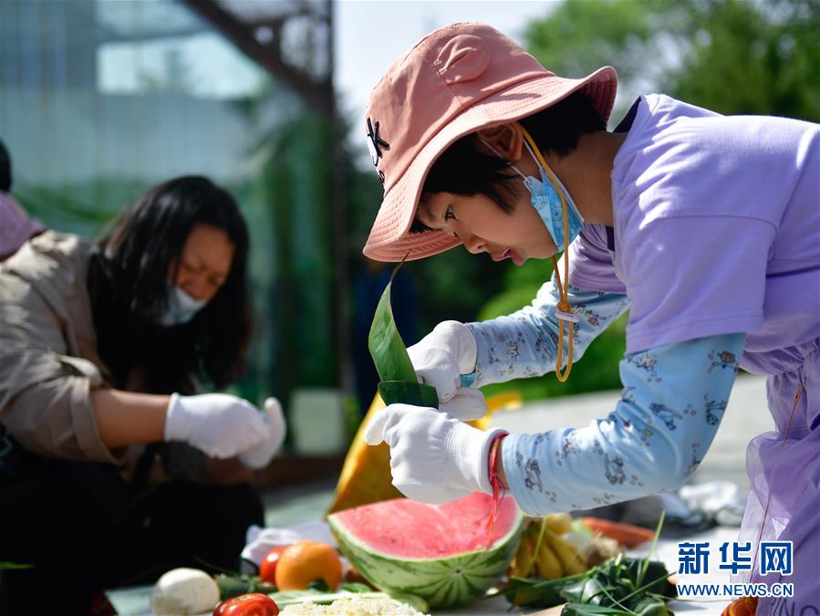 6月25日,在青海省西寧野生動物園,一位小朋友在給粽子裝餡料。新華社記者 張龍 攝