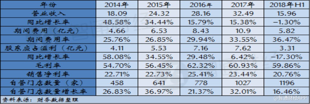 根據(jù)智通財(cái)經(jīng)APP的梳理,周黑鴨自營(yíng)門店數(shù)量在2014年為458家,此后三年公司自營(yíng)門店數(shù)量每年都有超過(guò)20%的增長(zhǎng),但期間公司營(yíng)業(yè)收入增幅卻呈現(xiàn)放緩的趨勢(shì)。與此同時(shí),公司門店數(shù)量的增長(zhǎng)也帶來(lái)費(fèi)用率逐年提升,截至2017年,公司期間費(fèi)用率達(dá)到33.55%,以至于公司凈利潤(rùn)增速同比下滑超過(guò)23個(gè)百分點(diǎn)。公司2018年中期財(cái)報(bào)顯示,上半年公司門店數(shù)量?jī)粼鲩L(zhǎng)169家,較2017年增長(zhǎng)16.46%,門店數(shù)量快速增長(zhǎng)的勢(shì)頭雖然的已延續(xù),但卻支撐不起公司營(yíng)收繼續(xù)保持增長(zhǎng),同時(shí)公司期間費(fèi)用率進(jìn)一步提升至36.47%,導(dǎo)致盈利水平大幅下滑。
