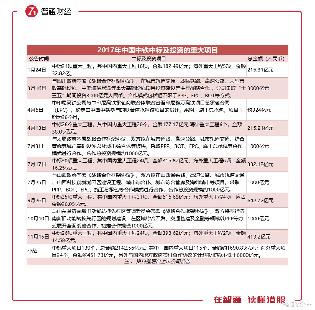 智通財(cái)經(jīng)APP注意到,雖然新簽合同金增速放緩,但中標(biāo)的重大項(xiàng)目卻大幅增加。據(jù)披露,中國(guó)中鐵上半年中標(biāo)的重大工程項(xiàng)目(不含與地方政府簽訂的戰(zhàn)略合作協(xié)議)達(dá)到102個(gè),而去年同期僅為49個(gè),涉及項(xiàng)目的金額更是后者的近3倍。