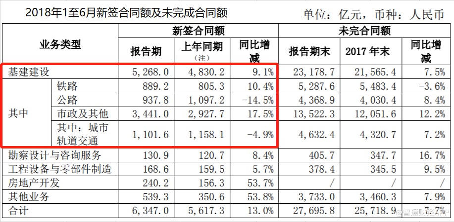 今年上半年,中國(guó)中鐵基建建設(shè)業(yè)務(wù)新簽合同5268億元,同比增長(zhǎng)9.1%,盡管依然維持增長(zhǎng),但增速較2017年上半年的32.5%大幅放緩,其中公路及城市軌道交通新簽合同額錄得負(fù)增長(zhǎng)。