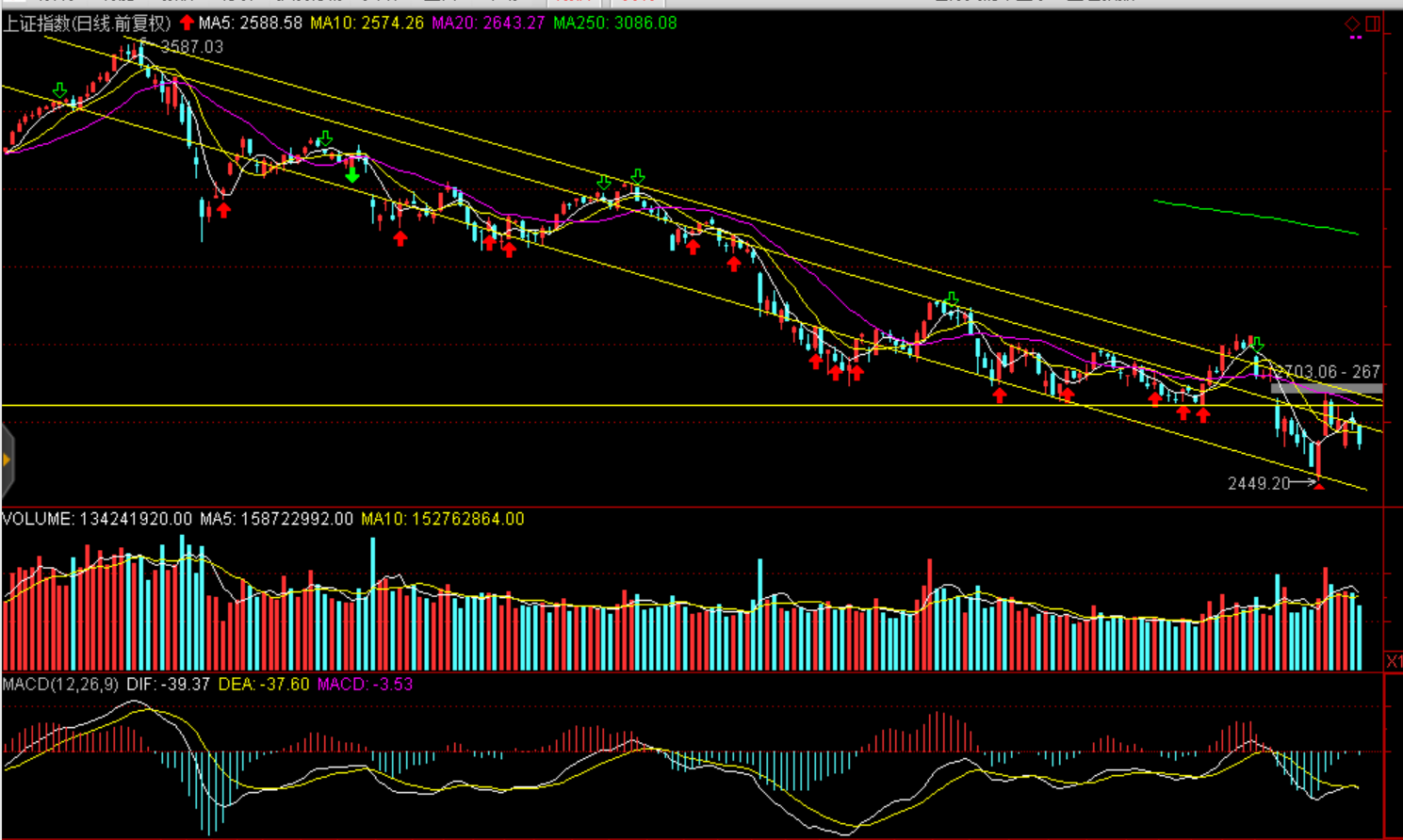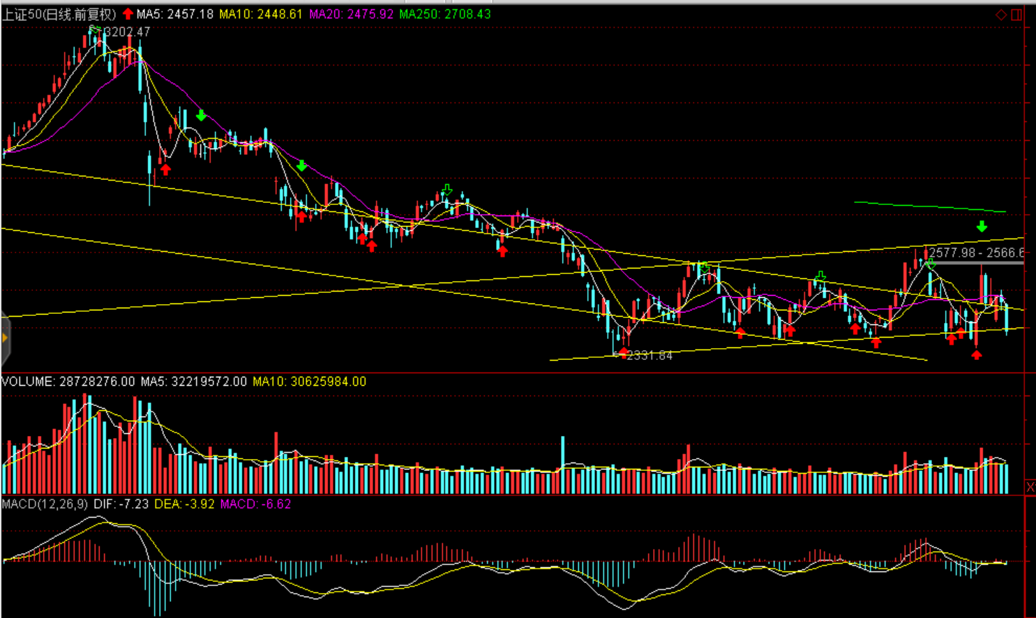周一兩市股指全天震蕩下跌,股指均報(bào)收中陰線。上證50跌3.21%報(bào)2389.58點(diǎn),滬綜指收跌2.18%報(bào)2542.1點(diǎn),深證成指跌2.43%報(bào)7322.24點(diǎn),創(chuàng)業(yè)板指跌1.01%報(bào)1250.48點(diǎn)。兩市僅成交2554億元,環(huán)比減少271億元,北上資金今日逆勢凈流入逾29億元。盤面看白酒領(lǐng)跌大消費(fèi)白馬,茅臺(tái)跌停引發(fā)蝴蝶效應(yīng),食品、家電、醫(yī)藥聯(lián)袂大幅下跌,資金集中流出消費(fèi)白馬。