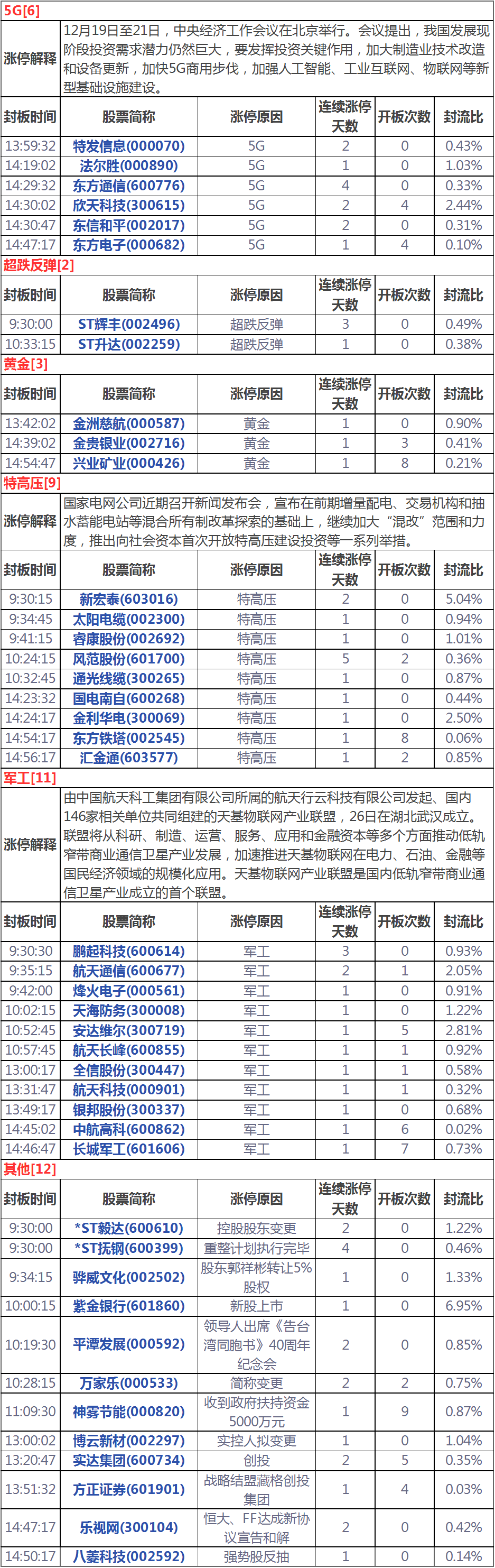 今天漲停家數(shù)較上一交易日增加,兩市43家漲停,跌停24家。成交量方面,滬市成交1069億元,深市成交1452億元,兩市總成交額約為2521元,較上一交易日放量259億元。盤面上,軍工、黃金、特高壓等板塊漲幅居前,5G、白酒、次新股等板塊跌幅居前。