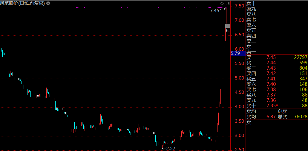 風(fēng)范股份自去年12月26日以來已連續(xù)獲得10個漲停,股價一路飆升至7.45元,成為A股新妖王。
