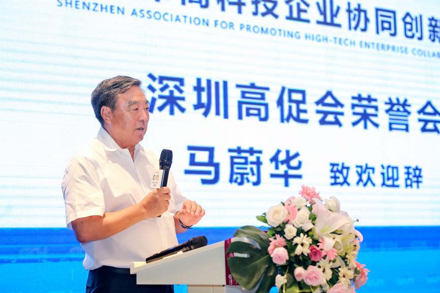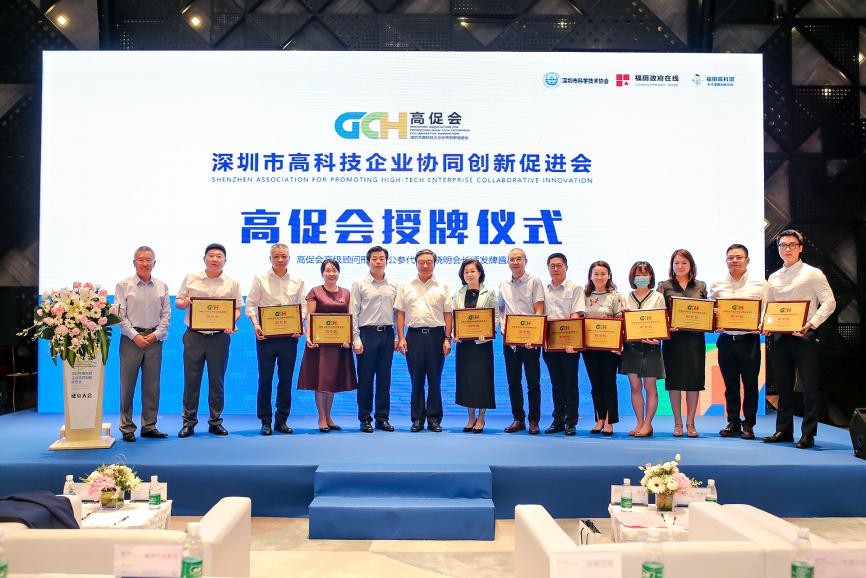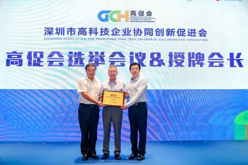 高促會(huì)會(huì)長(zhǎng)靳曉明因北京疫情原因無(wú)法來到現(xiàn)場(chǎng),由高促會(huì)高級(jí)顧問邢繼俊代表靳會(huì)長(zhǎng)接受由榮譽(yù)會(huì)長(zhǎng)馬蔚華和福田區(qū)科技創(chuàng)新局局長(zhǎng)張忠暉頒發(fā)的高促會(huì)會(huì)長(zhǎng)牌匾。