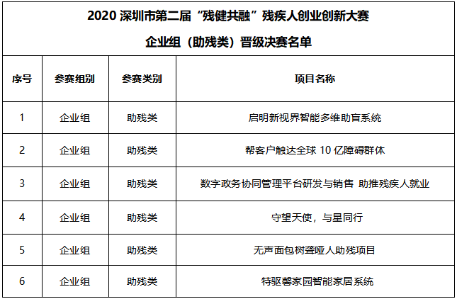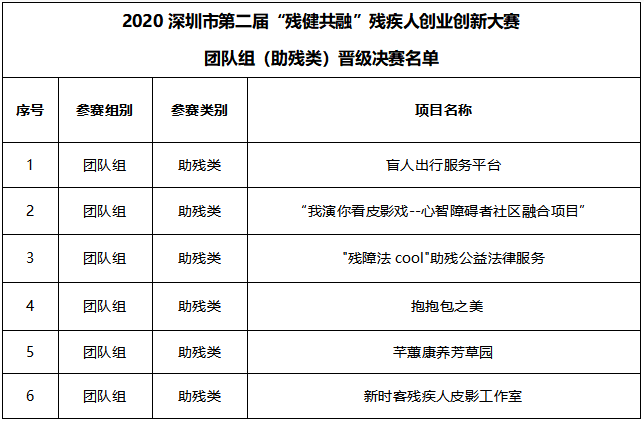 2020深圳市第二屆“殘健共融”殘疾人創(chuàng)業(yè)創(chuàng)新大賽團(tuán)隊(duì)組(助殘類)晉級(jí)決賽名單