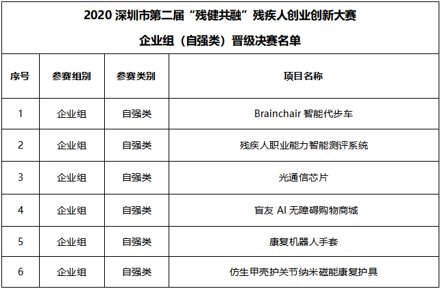 2020深圳市第二屆“殘健共融”殘疾人創(chuàng)業(yè)創(chuàng)新大賽企業(yè)組(自強(qiáng)類)晉級(jí)決賽名單