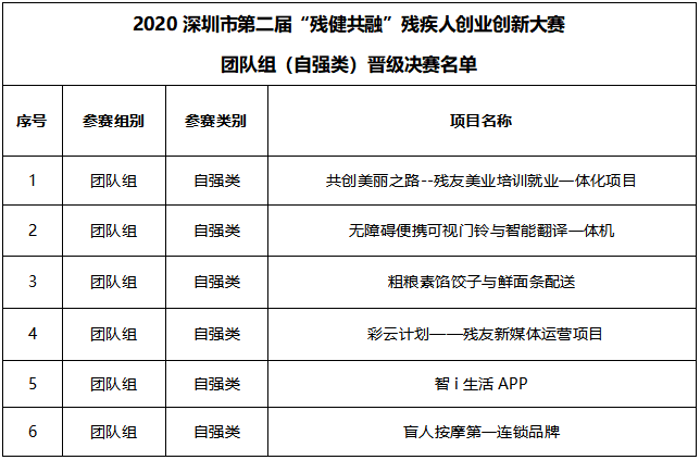 2020深圳市第二屆“殘健共融”殘疾人創(chuàng)業(yè)創(chuàng)新大賽團(tuán)隊(duì)組(自強(qiáng)類)晉級(jí)決賽名單