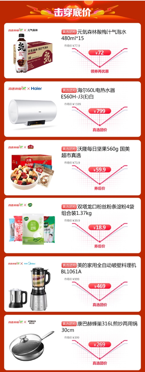 參與真選萬人團(tuán)的產(chǎn)品,大家電如海爾電熱水器,市場價1599元,真選團(tuán)購價低至799元;美的滾筒洗衣機,市場價3599元,真選團(tuán)購價2499元……優(yōu)惠力度非常之大,部分產(chǎn)品優(yōu)惠可超千元。