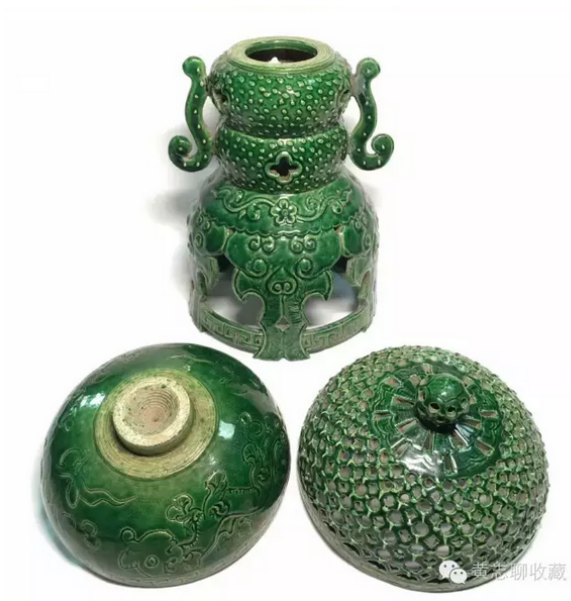 香薰在古代是頗為流行的室內(nèi)陳設(shè)用器,形制多樣,材質(zhì)不一。漢唐時(shí)期出土的香薰眾多,如有名的漢代博山爐,唐代香薰球等。兩宋時(shí)期,實(shí)行文人治國(guó),香具更是盛行,影響所及,同時(shí)并存的遼、金兩朝也頗為風(fēng)行。當(dāng)然,香具中也區(qū)分宅舍用及寺廟用、宮殿用等。其中寺廟及宮殿用品多為成對(duì)擺放,講究對(duì)稱之美,顯得莊重大方。而宅舍之用更為推崇雅致,趣味。下面介紹的這件綠釉香薰應(yīng)為遼金時(shí)期的寺廟用品。 香薰高31.5cm、直徑14.5cm,整體呈豆式。豆是先秦禮器,用以在祭祀、宴饗中盛放肉食。在家廟祭祀中,豆是不可或缺的禮儀用具,早期豆用竹編成,后用青銅鑄造,因此在禮書中稱“籩豆”。此對(duì)香薰延續(xù)了青銅豆的大體形制,上作球形,香盤半圓,蓋為鏤空半圓,扣合后渾然如一。香盤可拆卸,安插于支座上。座上部為雙扁圓狀疊壓,兩側(cè)裝飾螭龍耳;下部呈鏤空裙擺式,承以托泥,穩(wěn)重大方。通體施綠釉,釉面潤(rùn)澤,純凈自然。器身點(diǎn)綴穿花龍紋,如意紋,加之裙擺上的龕形開(kāi)光,推測(cè)為當(dāng)時(shí)高等級(jí)的寺廟的佛前薰香供器。 欣賞更多藏品,歡迎瀏覽【黃志博物館】網(wǎng)站。 我們會(huì)介紹更多的收藏知識(shí)、推薦更多優(yōu)質(zhì)優(yōu)價(jià)的藏品供您了解和選擇,也歡迎您把這些分享給朋友們,讓大家一起來(lái)了解歷史文化、體會(huì)收藏的快樂(lè)!