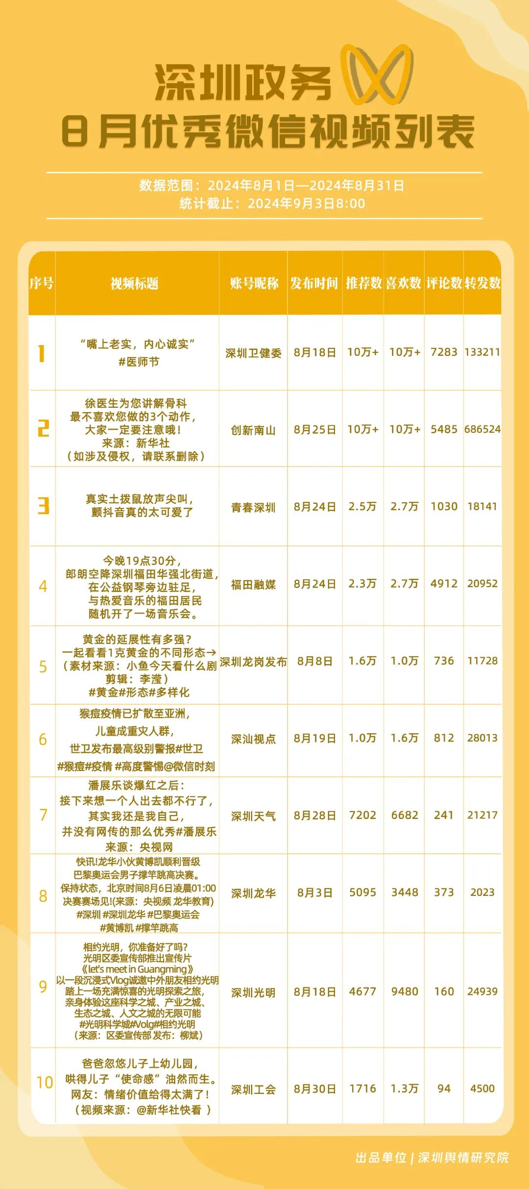8月,“幸福福田”“深圳龍崗發(fā)布”“深圳衛(wèi)健委”“深圳龍華”“創(chuàng)新南山”“深圳人社”“深圳光明”“羅湖發(fā)布”“濱海寶安”和“坪山發(fā)布”共10個(gè)政務(wù)頭條號(hào)入選榜單。相關(guān)賬號(hào)的文章《“為愛瘋狂,怎么3天后‘下面’喜提美乃滋?”》《最新消息!價(jià)格即將調(diào)整!時(shí)間就在→》等貼近民生,傳遞實(shí)用信息,收獲了較高的閱讀量和點(diǎn)贊數(shù)。