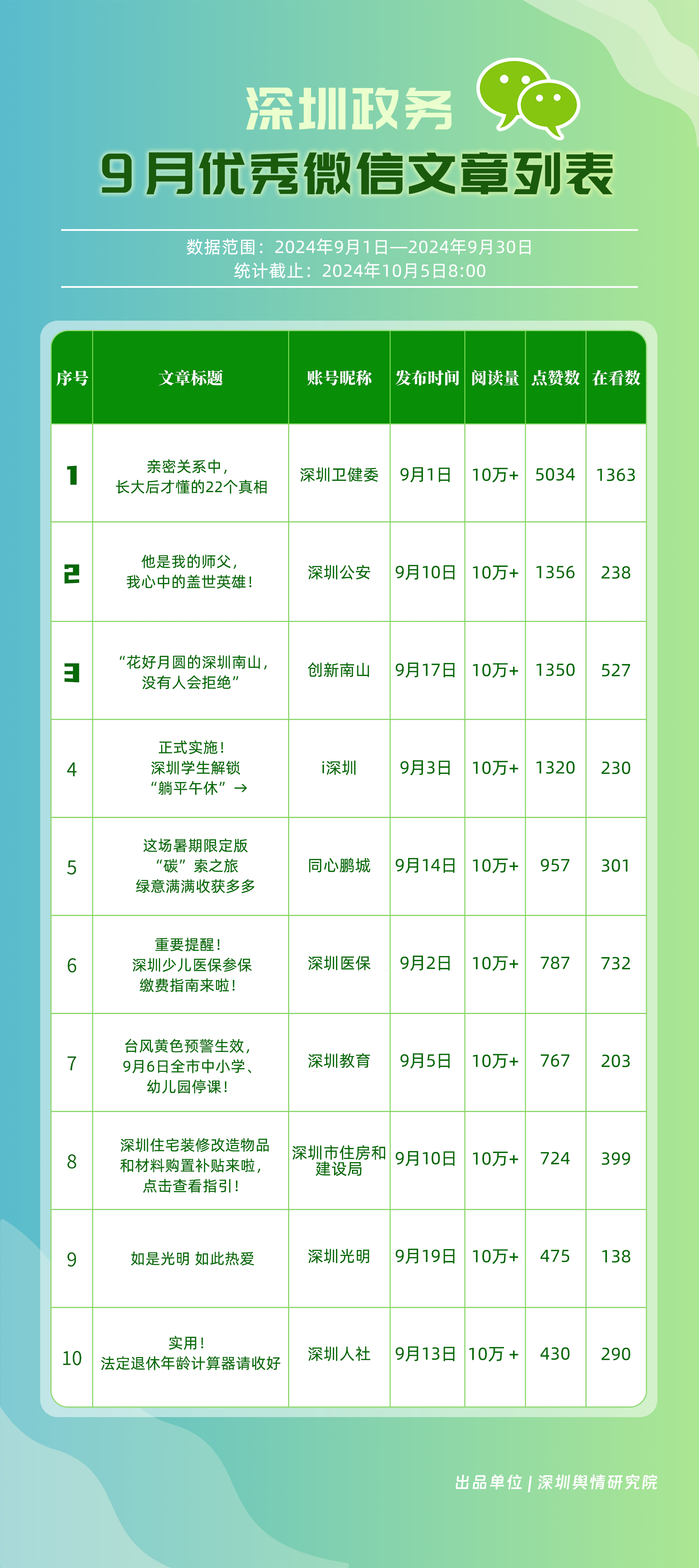 9月,“幸福福田”“深圳龍崗發(fā)布”“創(chuàng)新南山”“深圳龍華”“羅湖發(fā)布”“深圳光明”“青春深圳”“深圳衛(wèi)健委”“濱海寶安”和“深圳公安”共10個政務(wù)頭條號入選“優(yōu)秀政務(wù)頭條號”榜單。文章《剛剛!20多分鐘警報響徹深圳,不少人瞬間淚目……》涉及重大歷史節(jié)點(diǎn),引發(fā)市民深刻共鳴,《耳朵總是癢癢癢,是怎么回事?》《強(qiáng)冷空氣即將抵達(dá)廣東!國慶出游天氣……》等深入民生領(lǐng)域、緊貼節(jié)假日需求,提供了健康知識科普和氣象信息,以高度實(shí)用價值獲得網(wǎng)民點(diǎn)贊。