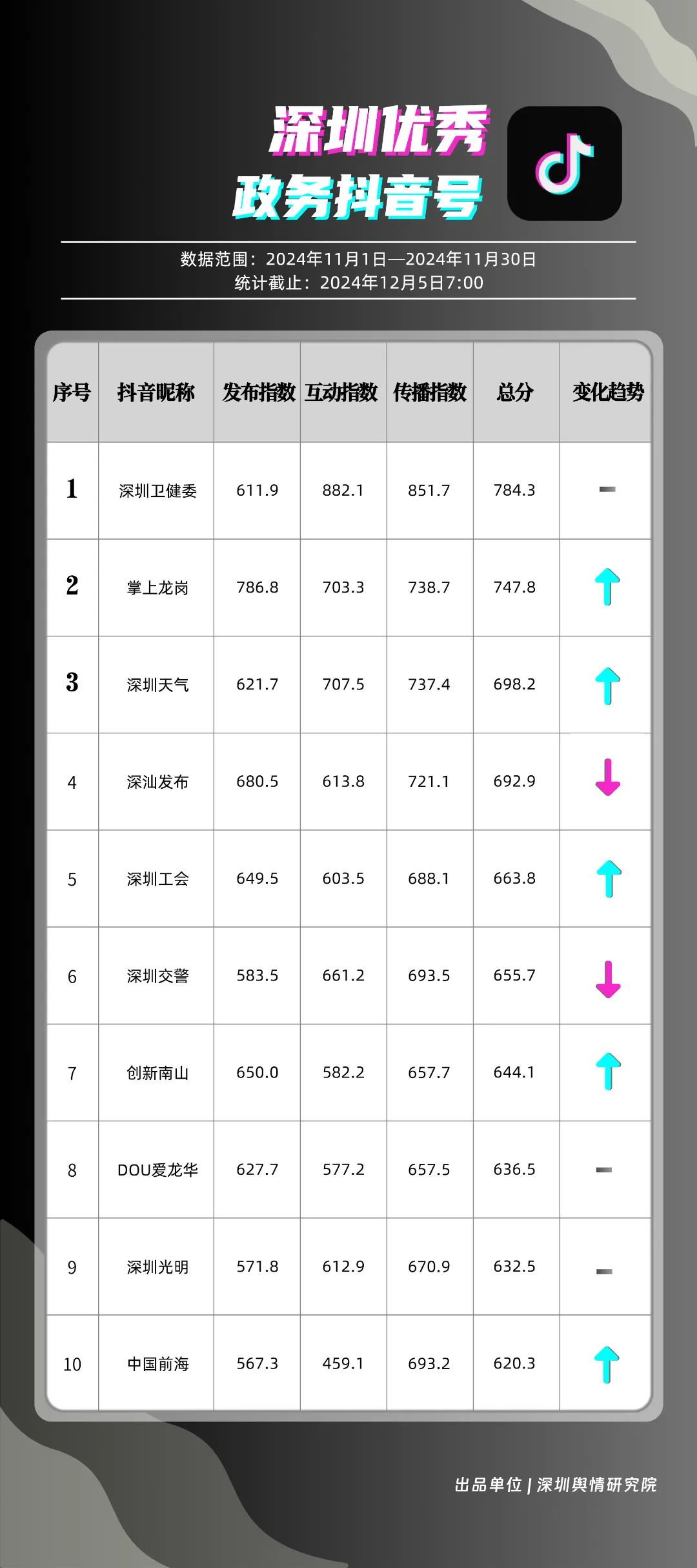 11月,“深圳衛(wèi)健委”“深圳龍崗發(fā)布”“幸福福田”“i深圳”“創(chuàng)新南山”“青春深圳”“深圳光明”“深圳工會”“深圳教育”“深圳龍華”等30個(gè)賬號入選“深圳優(yōu)秀政務(wù)微信公眾號”。其中,“深圳衛(wèi)健委”以802.2分位于榜單首位,“深圳龍崗發(fā)布”“幸福福田”“i深圳”排名保持靠前?!皠?chuàng)新南山”“深圳光明”則憑借內(nèi)容質(zhì)量、創(chuàng)新性的提升,展現(xiàn)了政務(wù)宣傳的新活力,排名有所提升。