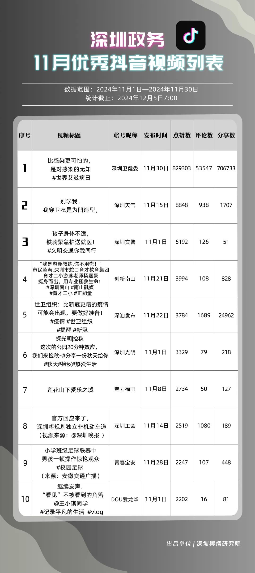 11月,“深圳衛(wèi)健委”“掌上龍崗”“深圳天氣”“深汕發(fā)布”“深圳工會”“深圳交警”“創(chuàng)新南山”“DOU愛龍華”“深圳光明”“中國前海”共10個(gè)政務(wù)抖音號獲得“深圳優(yōu)秀政務(wù)抖音號”稱號。“深圳衛(wèi)健委”憑借高質(zhì)量劇情內(nèi)容,巧妙融入健康知識,視頻累計(jì)收獲近百萬點(diǎn)贊。同時(shí),“掌上龍崗”和“深圳天氣”也在視頻內(nèi)容創(chuàng)新上不斷探索,通過優(yōu)化宣傳策略和信息傳播方式,使得網(wǎng)民能夠在輕松愉快的氛圍中了解龍崗區(qū)的最新動態(tài)和深圳的天氣信息,展現(xiàn)了政務(wù)抖音號的獨(dú)特魅力與社會影響力。