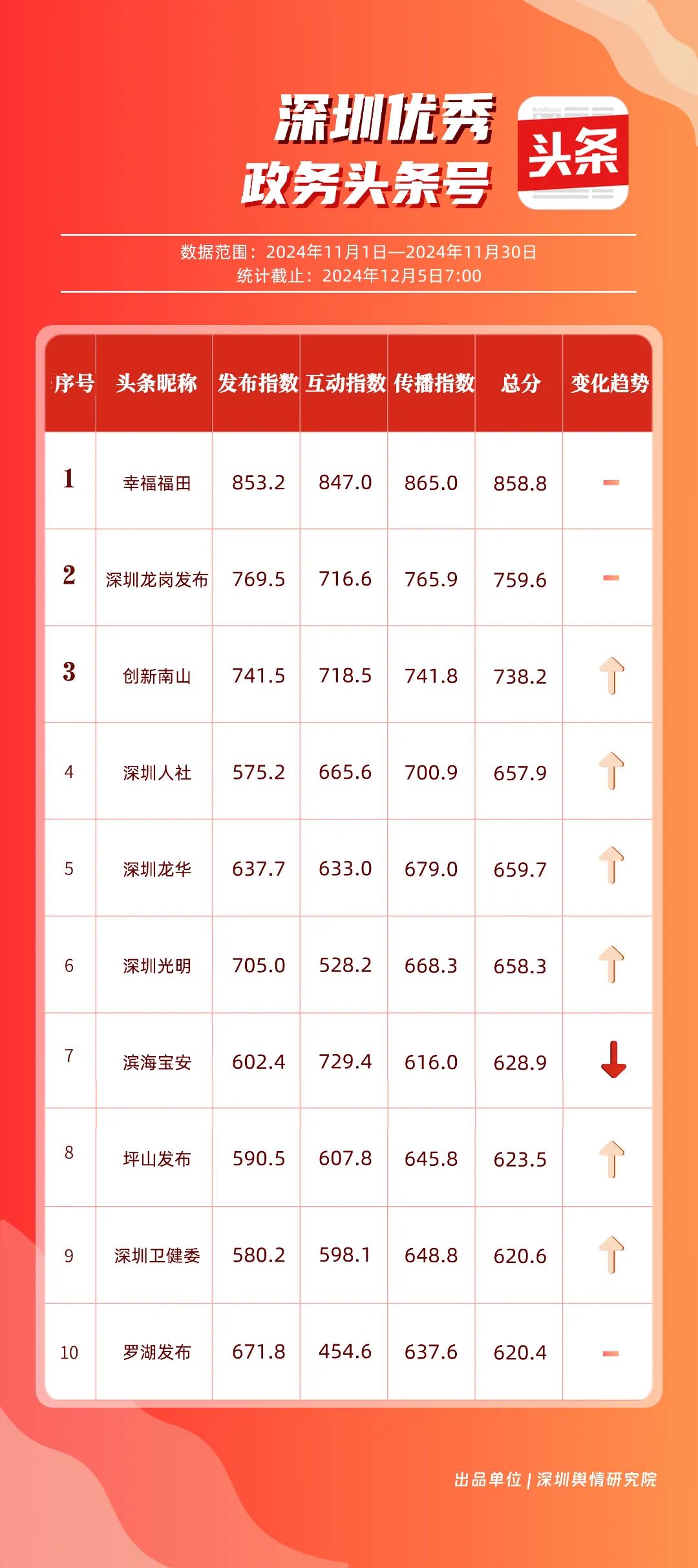 11月,“幸福福田”“深圳龍崗發(fā)布”“創(chuàng)新南山”“深圳人社”“深圳龍華”“深圳光明”“濱海寶安”“坪山發(fā)布”“深圳衛(wèi)健委”“羅湖發(fā)布”共10個(gè)政務(wù)頭條號入選“優(yōu)秀政務(wù)頭條號”榜單?!靶腋8L铩卑l(fā)布大量民生相關(guān)信息,穩(wěn)居第一?!吧钲邶垗彴l(fā)布”同樣表現(xiàn)不凡,排名始終位于前列,展現(xiàn)了其在信息傳播與政務(wù)服務(wù)方面的卓越能力。此外,賬號“創(chuàng)新南山”“深圳人社”“深圳龍華”“深圳光明”在榜單中的排名有所提升,為政務(wù)新媒體樹立了典范。