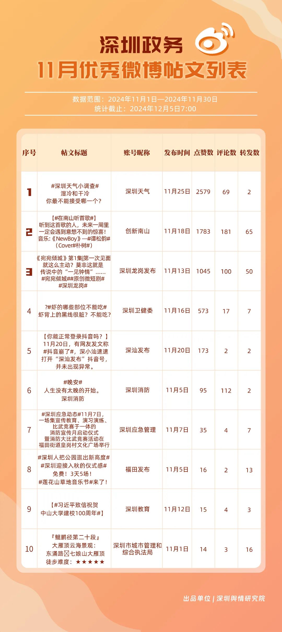 11月,“深圳天氣”“深圳衛(wèi)健委”“深圳龍崗發(fā)布”“深圳消防”“創(chuàng)新南山”“深圳應(yīng)急管理”“深圳公安”“深圳市城市管理和綜合執(zhí)法局”“福田發(fā)布”“深圳交警”等20個(gè)賬號入選“優(yōu)秀政務(wù)微博號”?!吧钲谔鞖狻薄吧钲谛l(wèi)健委”賬號在信息傳播上不斷精進(jìn),為市民帶來及時(shí)、優(yōu)質(zhì)且高效的資訊,內(nèi)容緊貼民生,贏得了市民的廣泛贊譽(yù),排名穩(wěn)定在前2名。同時(shí),“深圳龍崗發(fā)布”“深圳消防”和“創(chuàng)新南山”等賬號也能夠精準(zhǔn)滿足市民的信息需求,并在此基礎(chǔ)上提升市民閱讀體驗(yàn),推動了其在榜單上的穩(wěn)步提升,彰顯了政務(wù)微博的創(chuàng)新活力與社會價(jià)值。