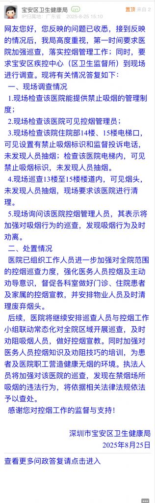 網(wǎng)友您好,您反映的問(wèn)題已收悉,接到反映的情況后,我局高度重視,第一時(shí)間要求醫(yī)院加強(qiáng)巡查,落實(shí)控?zé)煿芾砉ぷ?;同時(shí),要求寶安區(qū)疾控中心(區(qū)衛(wèi)生監(jiān)督所)到現(xiàn)場(chǎng)進(jìn)行調(diào)查。現(xiàn)將有關(guān)情況答復(fù)如下: