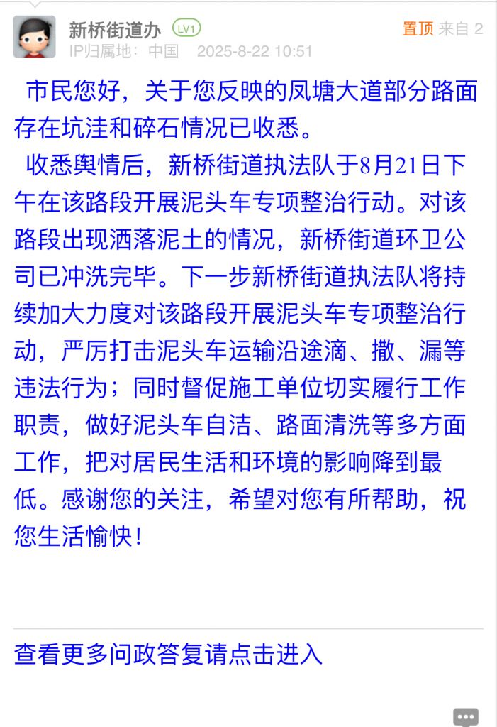 收悉輿情后,新橋街道執(zhí)法隊(duì)于8月21日下午在該路段開展泥頭車專項(xiàng)整治行動(dòng)。對(duì)該路段出現(xiàn)灑落泥土的情況,新橋街道環(huán)衛(wèi)公司已沖洗完畢。下一步新橋街道執(zhí)法隊(duì)將持續(xù)加大力度對(duì)該路段開展泥頭車專項(xiàng)整治行動(dòng),嚴(yán)厲打擊泥頭車運(yùn)輸沿途滴、撒、漏等違法行為;同時(shí)督促施工單位切實(shí)履行工作職責(zé),做好泥頭車自潔、路面清洗等多方面工作,把對(duì)居民生活和環(huán)境的影響降到最低。感謝您的關(guān)注,希望對(duì)您有所幫助,祝您生活愉快!
