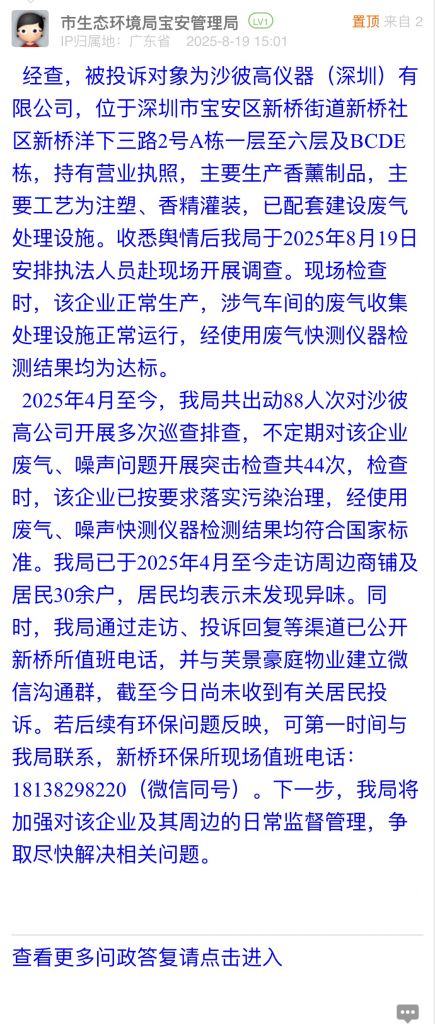 經(jīng)查,被投訴對(duì)象為沙彼高儀器(深圳)有限公司,位于深圳市寶安區(qū)新橋街道新橋社區(qū)新橋洋下三路2號(hào)A棟一層至六層及BCDE棟,持有營(yíng)業(yè)執(zhí)照,主要生產(chǎn)香薰制品,主要工藝為注塑、香精灌裝,已配套建設(shè)廢氣處理設(shè)施。收悉輿情后我局于2025年8月19日安排執(zhí)法人員赴現(xiàn)場(chǎng)開展調(diào)查。現(xiàn)場(chǎng)檢查時(shí),該企業(yè)正常生產(chǎn),涉氣車間的廢氣收集處理設(shè)施正常運(yùn)行,經(jīng)使用廢氣快測(cè)儀器檢測(cè)結(jié)果均為達(dá)標(biāo)。