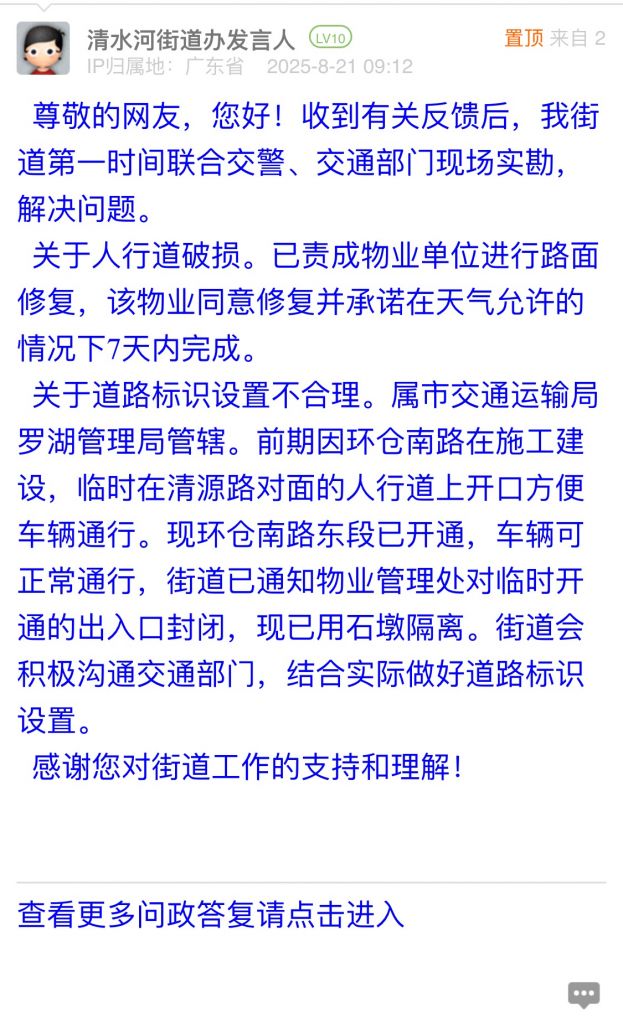 關(guān)于道路標(biāo)識(shí)設(shè)置不合理。屬市交通運(yùn)輸局羅湖管理局管轄。前期因環(huán)倉(cāng)南路在施工建設(shè),臨時(shí)在清源路對(duì)面的人行道上開口方便車輛通行?,F(xiàn)環(huán)倉(cāng)南路東段已開通,車輛可正常通行,街道已通知物業(yè)管理處對(duì)臨時(shí)開通的出入口封閉,現(xiàn)已用石墩隔離。街道會(huì)積極溝通交通部門,結(jié)合實(shí)際做好道路標(biāo)識(shí)設(shè)置。