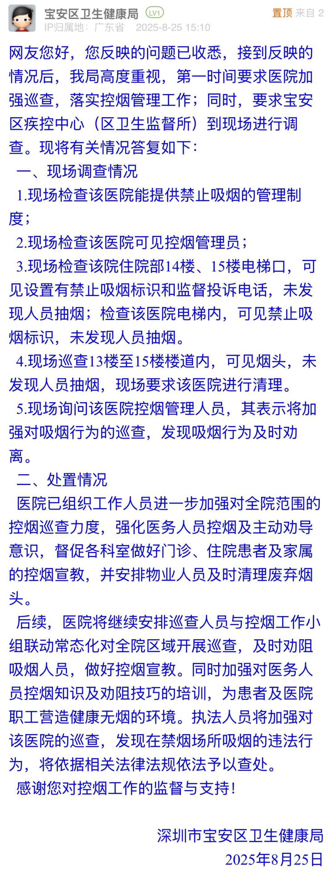 優(yōu)化建議:接到市民反饋后,寶安區(qū)衛(wèi)生健康局快速組織現(xiàn)場調(diào)查,核實(shí)醫(yī)院有禁煙制度、控?zé)煿芾韱T在崗,基礎(chǔ)控?zé)煷胧┖瞬榈轿?,值得點(diǎn)贊。但回應(yīng)中多次強(qiáng)調(diào)“未發(fā)現(xiàn)人員抽煙”,回避對(duì)歷史吸煙行為處置、煙頭來源及勸阻機(jī)制失效的解釋,與市民關(guān)切脫節(jié),難以消除市民對(duì)醫(yī)院日常控?zé)熌芰Φ膿?dān)憂,建議完善具體控?zé)煷胧?,如加裝煙感報(bào)警裝置,建立核查公示制度等,筑牢“無煙醫(yī)院”防線。