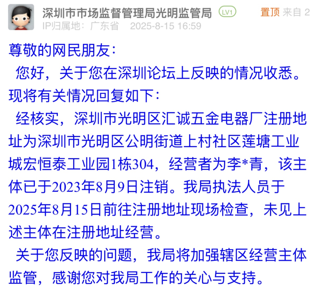 優(yōu)化建議:深圳市市場監(jiān)督管理局光明管理局的回應(yīng)中,核實(shí)了涉事電器廠已注銷,且不在注冊(cè)地經(jīng)營,也提及加強(qiáng)轄區(qū)主體監(jiān)管,但市民反映的排插套用注銷主體信息銷售、違規(guī)標(biāo)識(shí)3C標(biāo)志等關(guān)鍵問題,未得到明確解答。若回應(yīng)中能豐富指引類內(nèi)容,如告知市民可向平臺(tái)追責(zé)的途徑、提交證據(jù)的具體方式,為市民維權(quán)提供清晰方向,將更貼合市民需求,也能讓回應(yīng)更具實(shí)際意義。