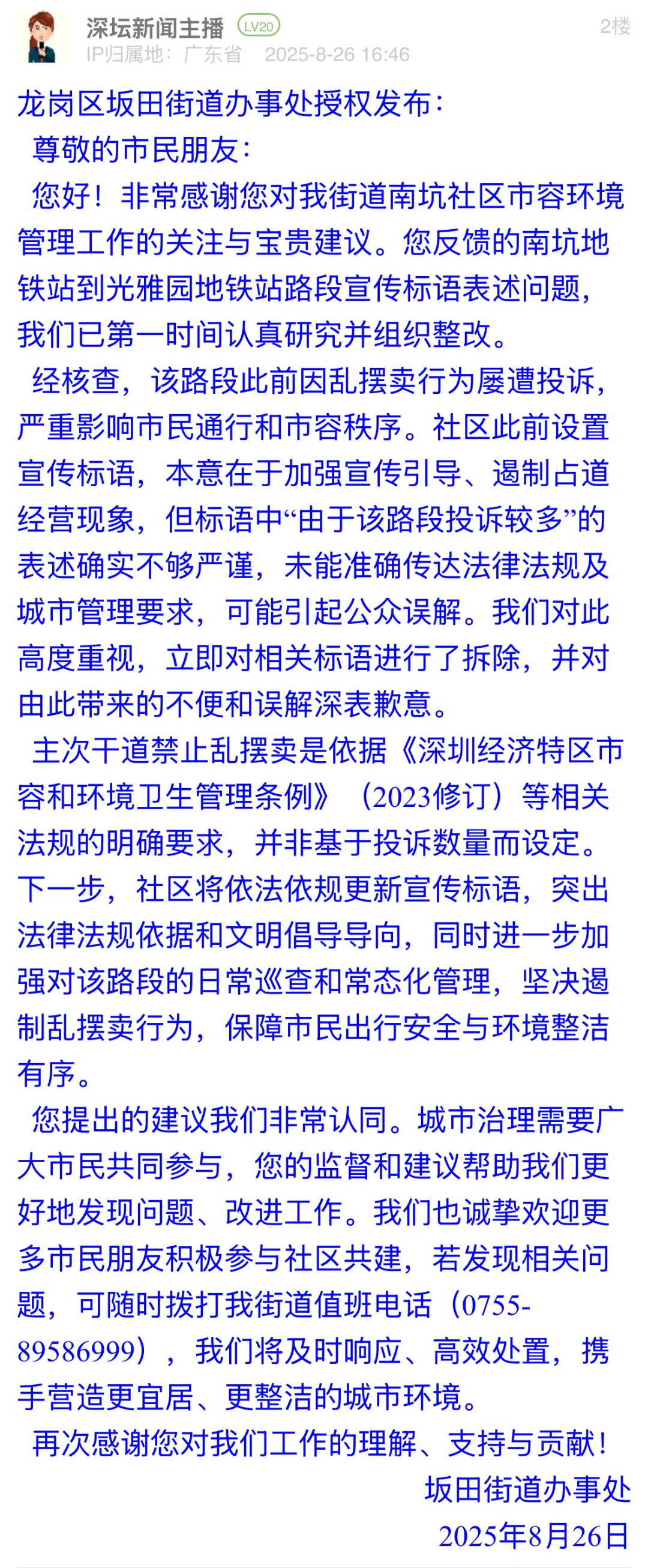 案例點(diǎn)評(píng):標(biāo)語表述不嚴(yán)謹(jǐn)可能引發(fā)公眾誤解,坂田街道辦展現(xiàn)出高效務(wù)實(shí)的態(tài)度,第一時(shí)間拆除涉事標(biāo)語,計(jì)劃更新標(biāo)語,明確標(biāo)語中提及的禁擺依據(jù)為法規(guī)要求而非投訴數(shù)量。回應(yīng)中,街道主動(dòng)致歉并公開整改邏輯,展現(xiàn)“直面問題不推諉”的擔(dān)當(dāng),更以“邀請(qǐng)市民參與共建”為切入點(diǎn),構(gòu)建“政府主導(dǎo)+公眾監(jiān)督”的治理閉環(huán)。此次整改有效化解因標(biāo)語表述不當(dāng)引發(fā)的公眾疑慮,彰顯了“以民為師”的共治智慧。