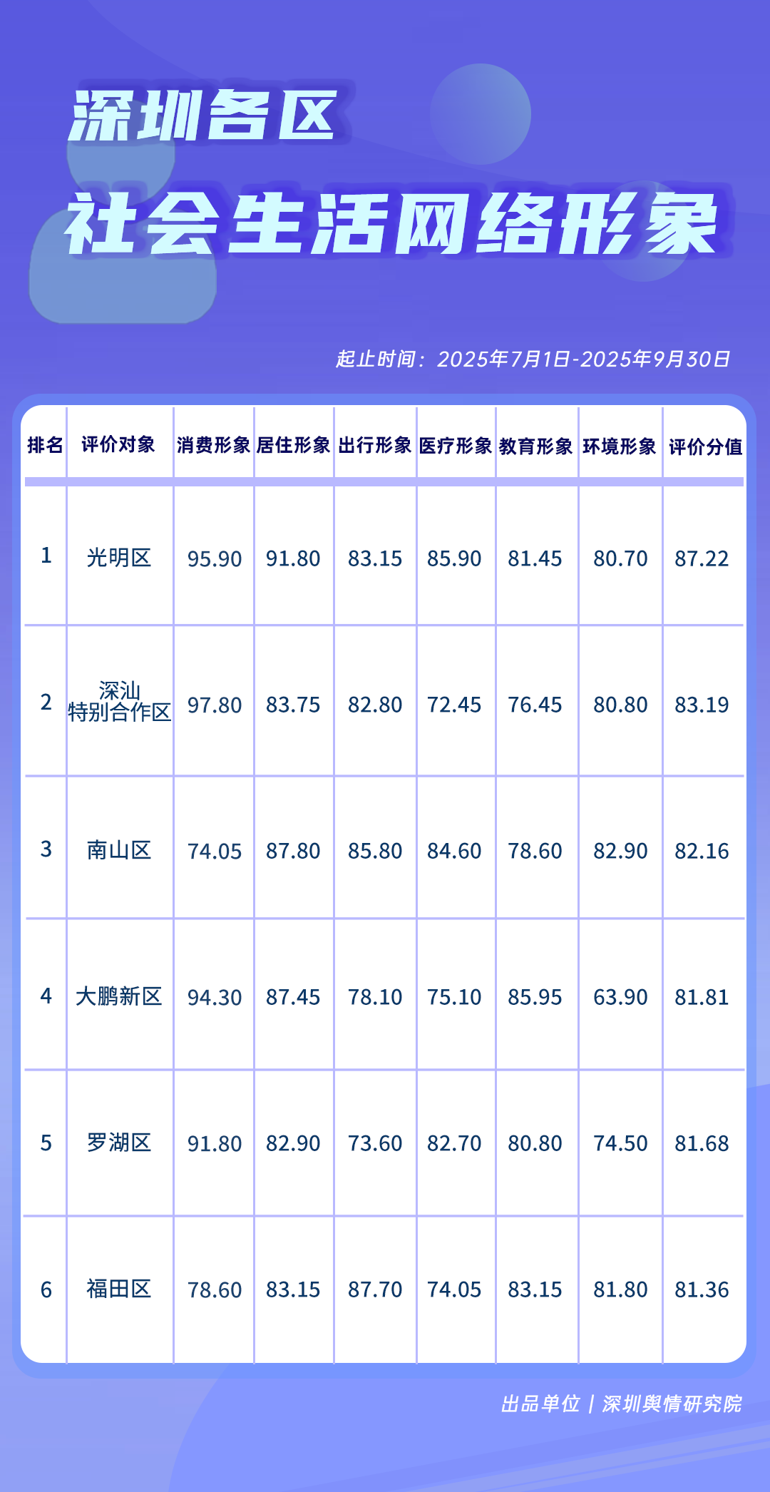 4. 深圳各區(qū)社會生活網(wǎng)絡(luò)形象榜:以消費形象、居住形象、出行形象、醫(yī)療形象、教育形象、環(huán)境形象為評價指標(biāo),綜合測算各區(qū)消費、居住、出行、醫(yī)療、教育、環(huán)境六大板塊在網(wǎng)絡(luò)平臺的提及數(shù)和正負(fù)面信息數(shù)量等多項數(shù)據(jù),最終根據(jù)不同的權(quán)重占比,計算得出評價分值。其中,消費、居住形象的權(quán)重占比均為20%;出行、醫(yī)療、教育及環(huán)境形象的權(quán)重占比均為15%。