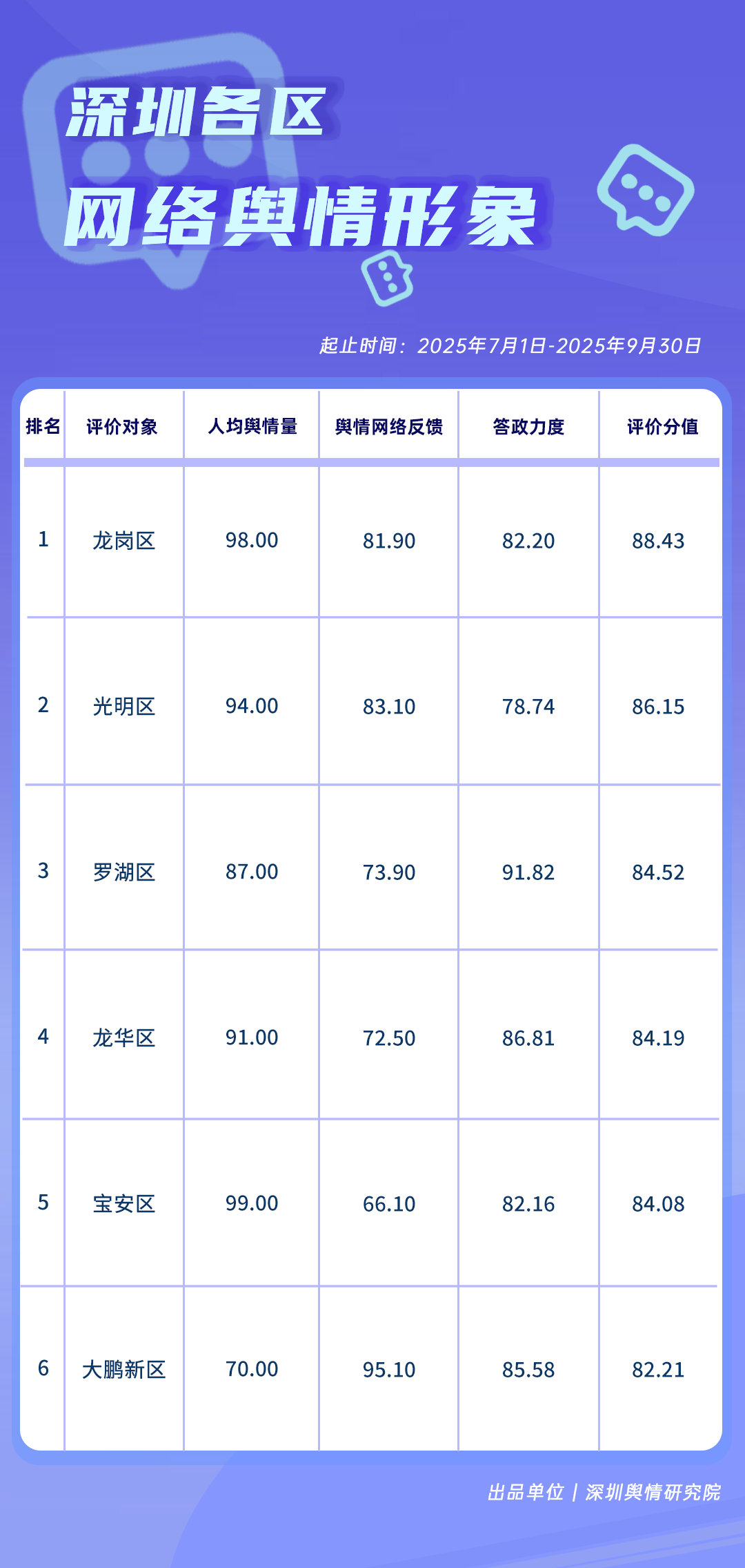 7-9月,在網(wǎng)絡(luò)輿情方面,龍崗區(qū)、光明區(qū)得分在86分以上,位居榜單前二,人均輿情量得分較高。羅湖區(qū)、龍華區(qū)、寶安區(qū)、大鵬新區(qū)在輿情治理方面也各有亮點,充分體現(xiàn)了各區(qū)在維護清朗網(wǎng)絡(luò)空間、高效回應(yīng)公眾關(guān)切方面的積極作為與責(zé)任擔(dān)當(dāng)。