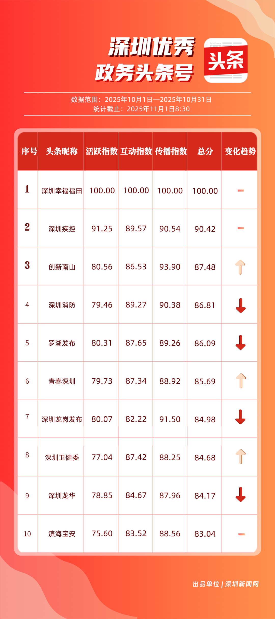 10月,“深圳幸福福田”“深圳疾控”“創(chuàng)新南山”“深圳消防”“羅湖發(fā)布”“青春深圳”“深圳龍崗發(fā)布”“深圳衛(wèi)健委”“深圳龍華”“濱海寶安”共10個(gè)政務(wù)頭條號(hào)入選“優(yōu)秀政務(wù)頭條號(hào)”榜單。“深圳幸福福田”在活躍、互動(dòng)、傳播均收獲較好成果,蟬聯(lián)榜首;“深圳疾控”得分超90分,持續(xù)發(fā)布民生健康類內(nèi)容,為市民健康保駕護(hù)航;“創(chuàng)新南山”內(nèi)容創(chuàng)作緊扣民生與區(qū)域特色,位列榜單第三名?!吧钲谙馈薄傲_湖發(fā)布”等賬號(hào)也位列榜單前列,成為區(qū)域政務(wù)新媒體內(nèi)容創(chuàng)新、信息傳遞的標(biāo)桿。