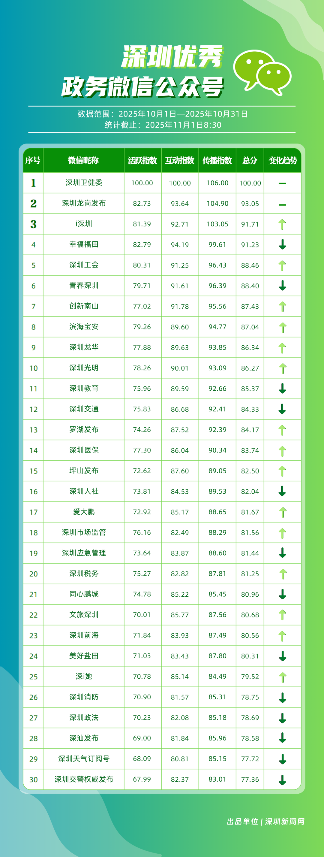 10月,“深圳衛(wèi)健委”“深圳龍崗發(fā)布”“i深圳”“幸福福田”“深圳工會(huì)”“青春深圳”“創(chuàng)新南山”“濱海寶安”“深圳龍華”“深圳光明”等30個(gè)政務(wù)微信公眾號(hào)榮登“深圳優(yōu)秀政務(wù)微信公眾號(hào)”榜單。10月,“深圳衛(wèi)健委”以總分100位居榜首,其持續(xù)以真誠、反套路的內(nèi)容,將專業(yè)健康知識(shí)轉(zhuǎn)化為網(wǎng)民喜聞樂見的“生活指南”,受到大量網(wǎng)民喜愛;“深圳龍崗發(fā)布”位居第二,持續(xù)發(fā)布高質(zhì)量內(nèi)容,成為市民獲取龍崗動(dòng)態(tài)的“第一窗口”;“i深圳”也發(fā)布政策、民生內(nèi)容,排名有所上升,位列第三;“幸福福田”“深圳工會(huì)”等也立足區(qū)域特色,通過多元內(nèi)容,展現(xiàn)各自的發(fā)展活力。