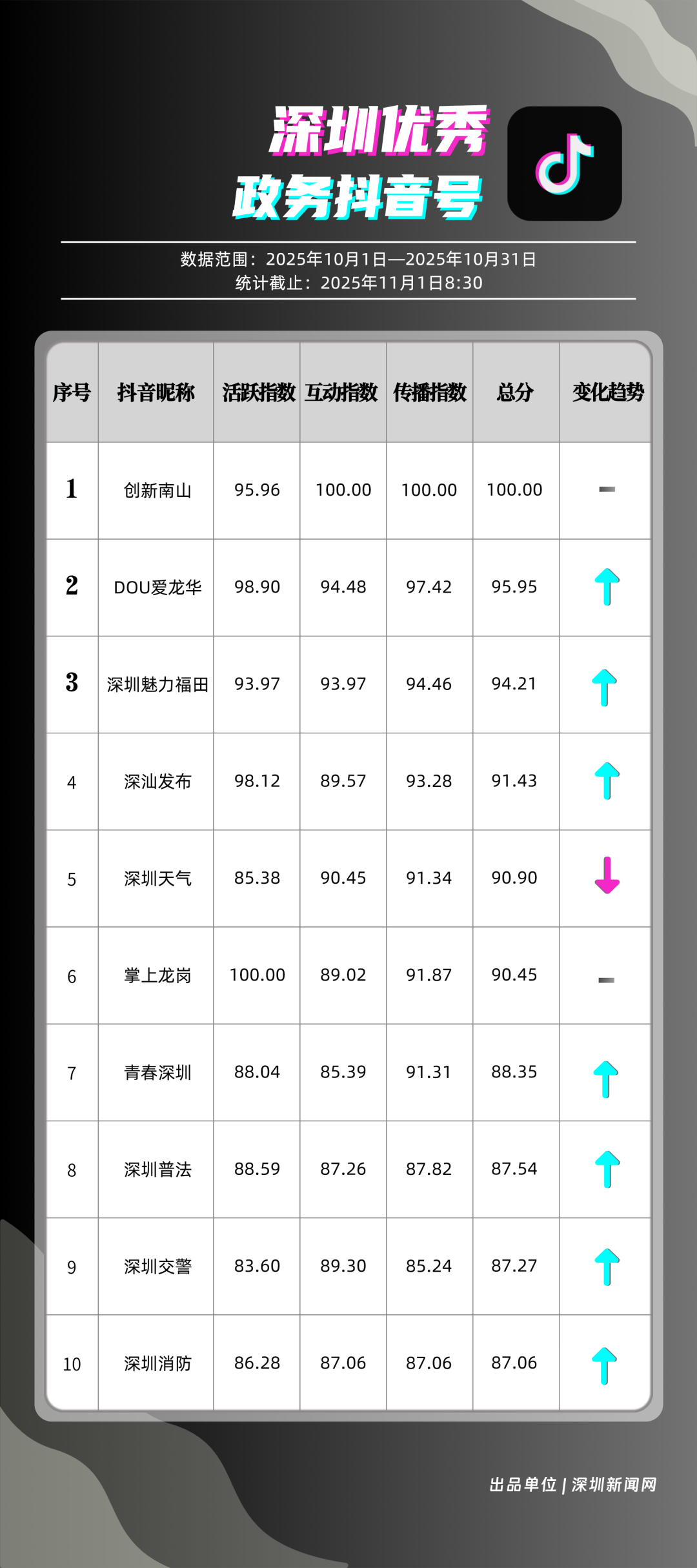 10月,獲得“優(yōu)秀政務(wù)抖音號(hào)”稱號(hào)的是“創(chuàng)新南山”“DOU愛龍華”“深圳魅力福田”“深汕發(fā)布”“深圳天氣”“掌上龍崗”“青春深圳”“深圳普法”“深圳交警”“深圳消防”?!皠?chuàng)新南山”以總分100分居于榜首,展現(xiàn)出其內(nèi)容創(chuàng)作對(duì)用戶的強(qiáng)大吸引力與傳播力;“DOU愛龍華”與“深圳魅力福田”分別位列第二、三位,得分在95分左右,排名較上期有所上升。“深汕發(fā)布”“深圳天氣”“掌上龍崗”等賬號(hào)得分均在90分以上,以年輕化表達(dá)展示實(shí)用信息,也收獲較好互動(dòng)、傳播成績。
