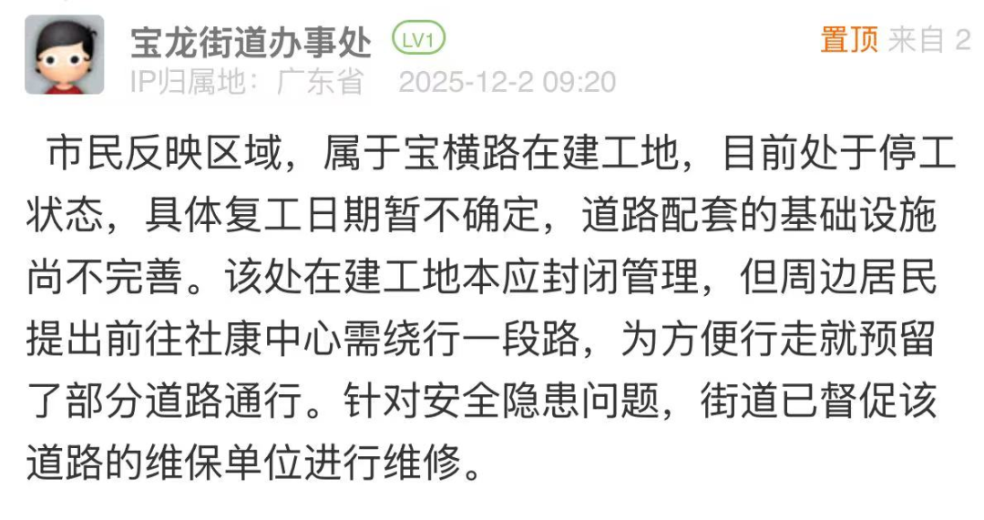 優(yōu)化建議:針對(duì)市民反映的道路在建工地預(yù)留道路路燈暗淡、路磚碎裂等問(wèn)題,帖文回應(yīng)存在“解釋多、舉措少”的短板,未能化解群眾多次投訴無(wú)果的不滿(mǎn)。同時(shí),“復(fù)工日期暫不確定”的表述易引發(fā)市民的疑惑與不滿(mǎn),后續(xù)有市民在評(píng)論區(qū)反饋該道路仍未啟動(dòng)維修工作,建議責(zé)任單位主動(dòng)協(xié)同項(xiàng)目建設(shè)、施工等責(zé)任主體,明確給出復(fù)工的預(yù)估時(shí)間或階段性處置方案及臨時(shí)性保障措施,推動(dòng)問(wèn)題解決。