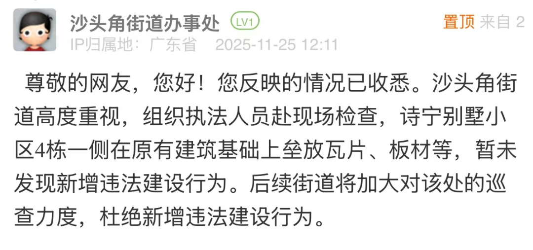 優(yōu)化建議:針對(duì)網(wǎng)民投訴的小區(qū)違建問(wèn)題,街道回應(yīng)僅以“未發(fā)現(xiàn)新增違法建設(shè)行為”簡(jiǎn)單回復(fù),尚有完善空間。若該點(diǎn)位存在建設(shè)年代久遠(yuǎn)、權(quán)屬界定模糊、涉及多主體協(xié)調(diào)等客觀難點(diǎn),可適度說(shuō)明,并在回應(yīng)中補(bǔ)充核查細(xì)節(jié),說(shuō)明后續(xù)處置方向與階段計(jì)劃,讓回應(yīng)更具可信度和實(shí)操性,回應(yīng)市民對(duì)“依法履職”的期待。